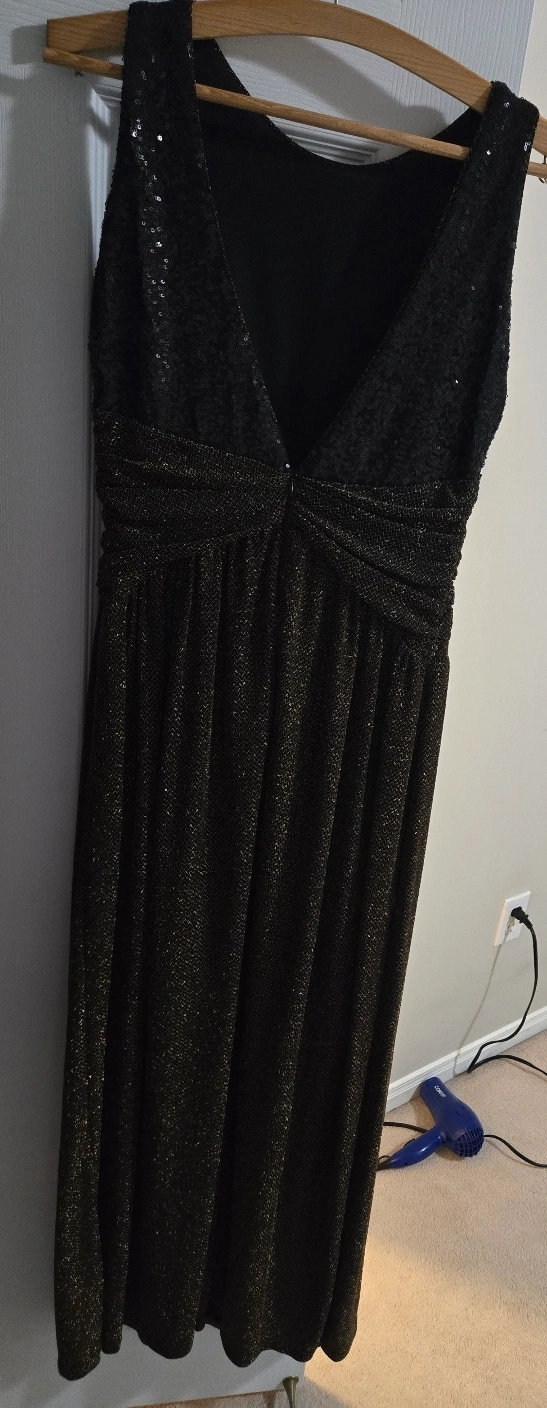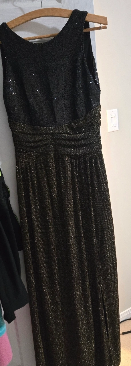 Beautiful black and gold sequined maxi dress. Sleeveless. Sequined bodice. Gold shimmer fabric skirt. Back zipper closure. Great for a special occasion.