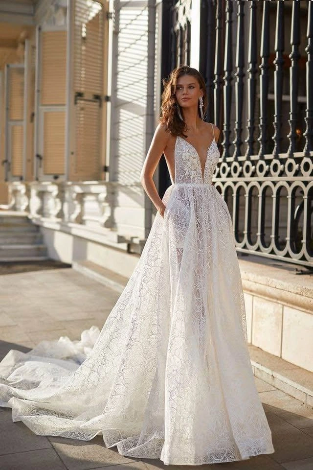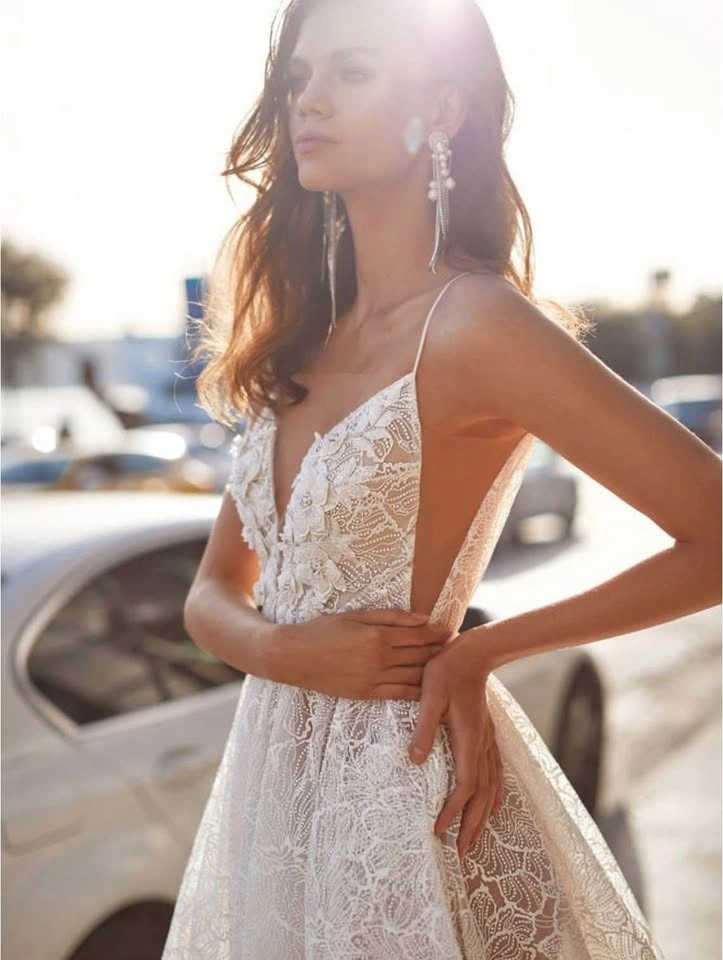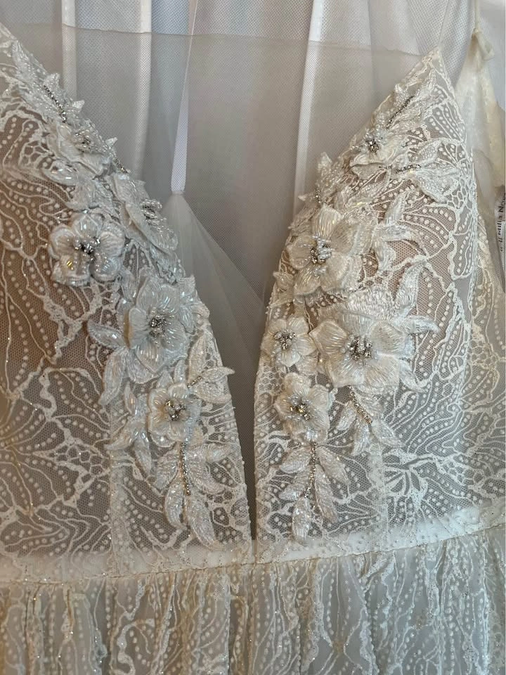 15New Milla Nova Bruna bridal gown. Never worn, only tried on. Size 8. Ivory colour. From the Milla Nova website: “Tender A-line, spaghetti straps wedding dress in white. Features a plunging V-neckline, side cutouts, open back, a semi-transparent lace skirt, and a long train.” Can provide original receipt. Motivated to sell - make an offer!