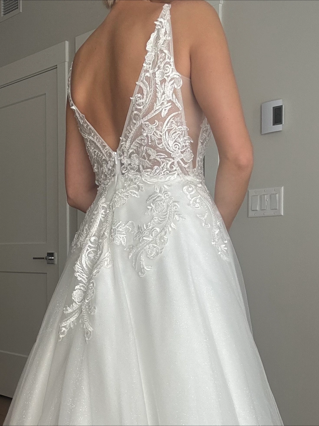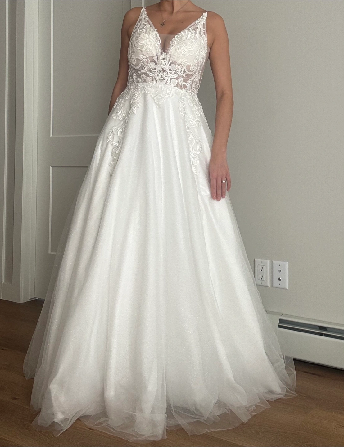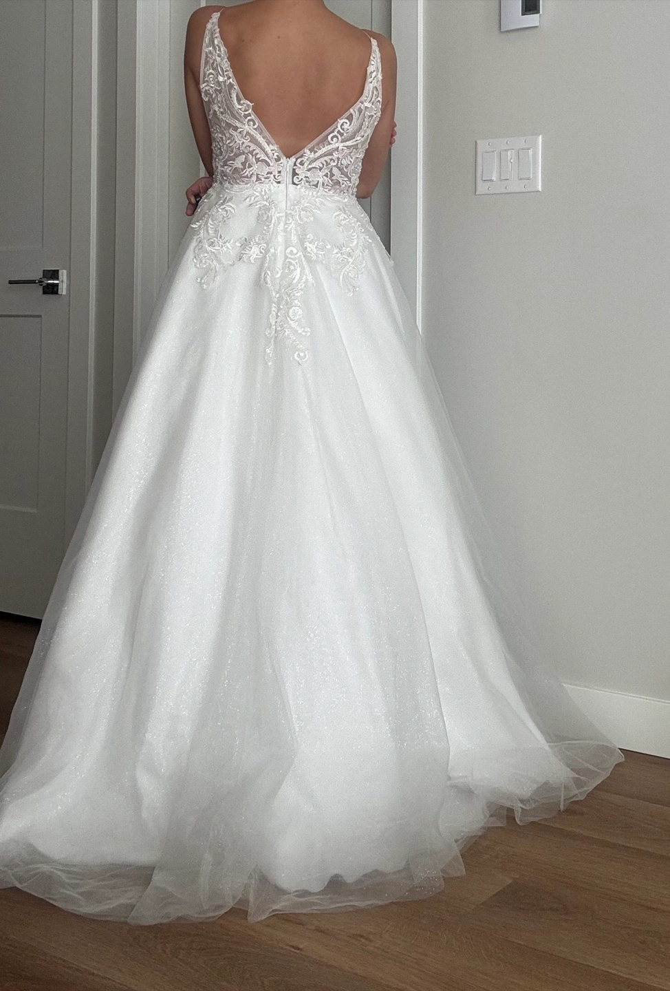 Selling a beautiful white wedding dress. It has a lovely lace design on the back. It is in excellent condition and ready for its next special day!