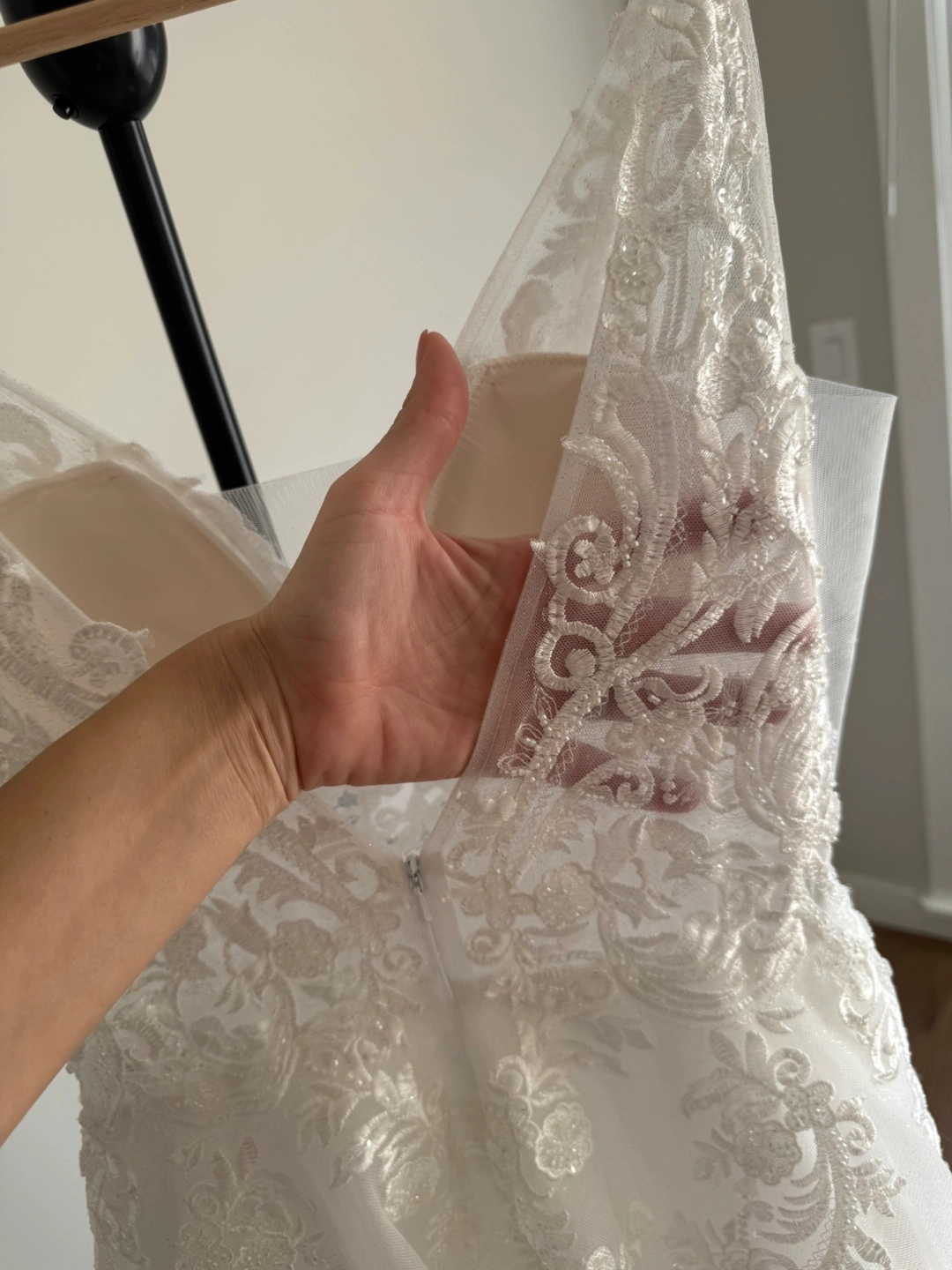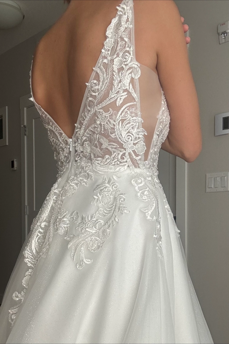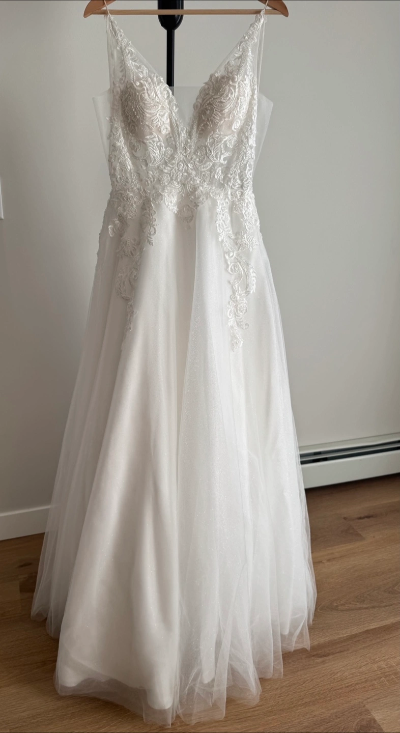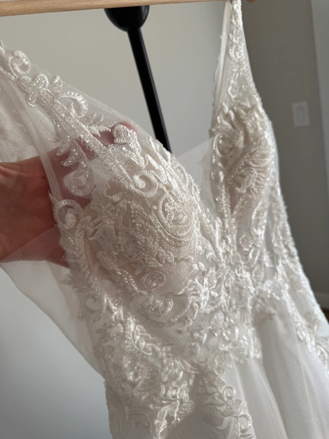 Selling a beautiful white wedding dress. It has a lovely lace design on the back. It is in excellent condition and ready for its next special day!