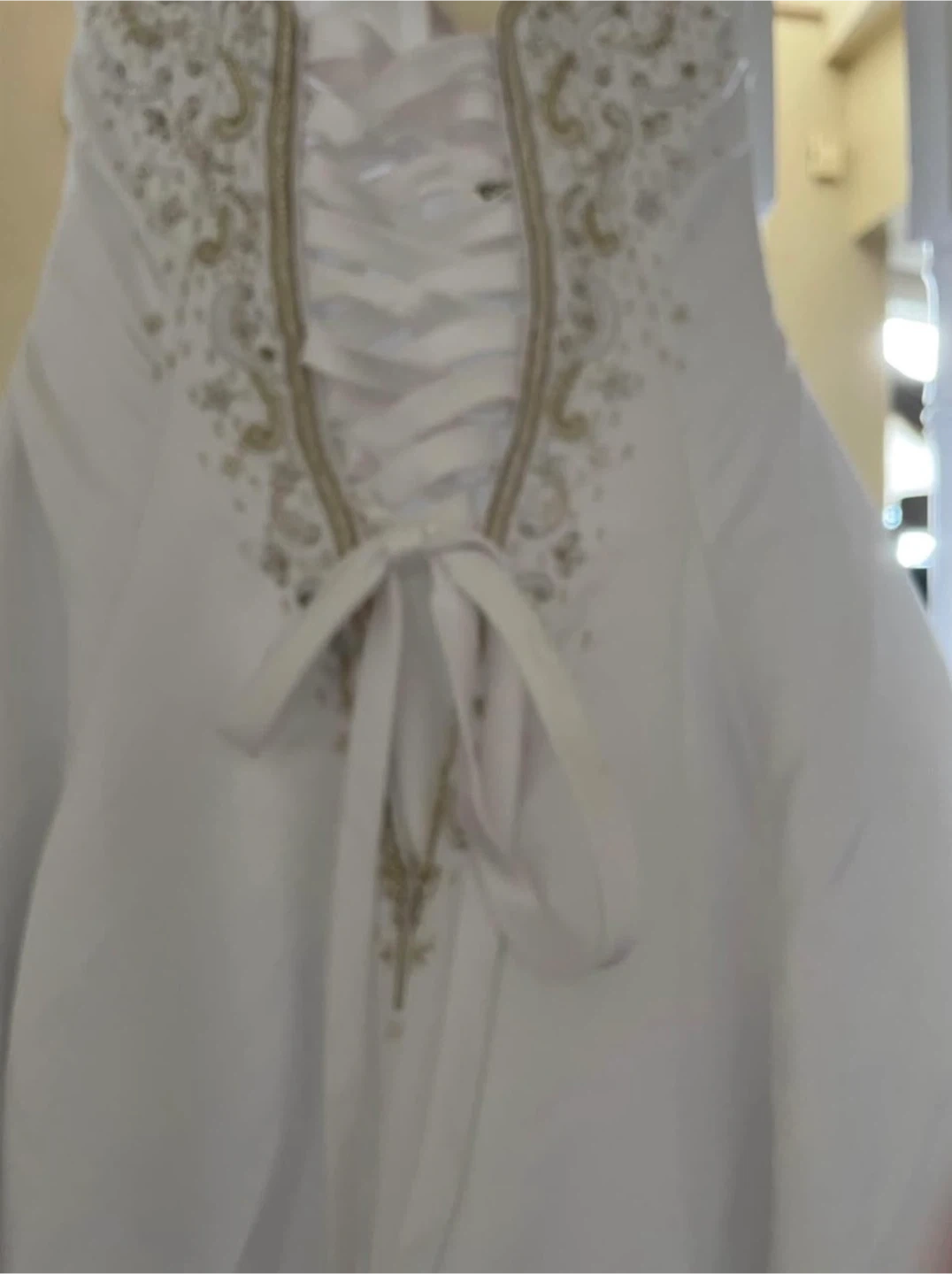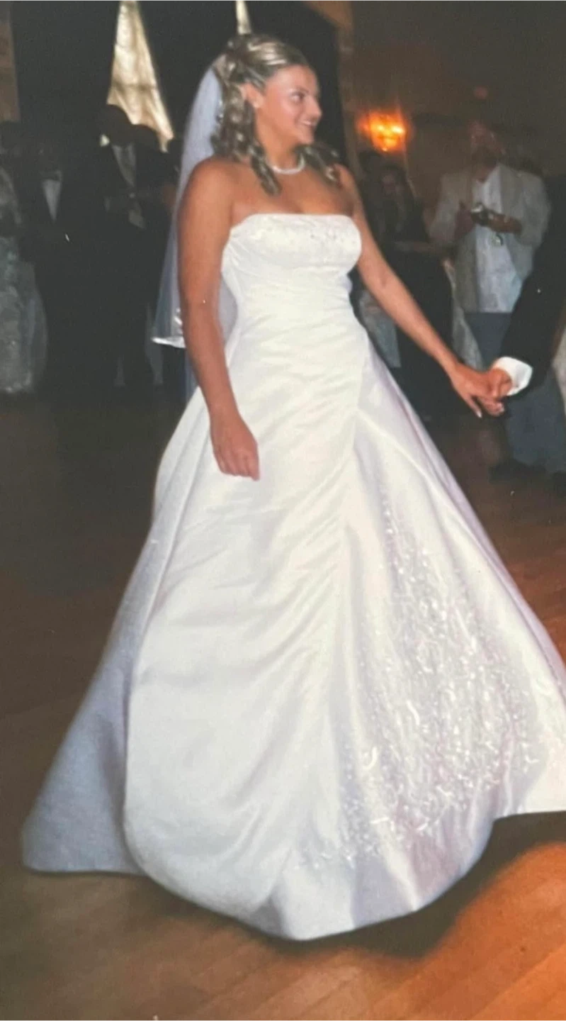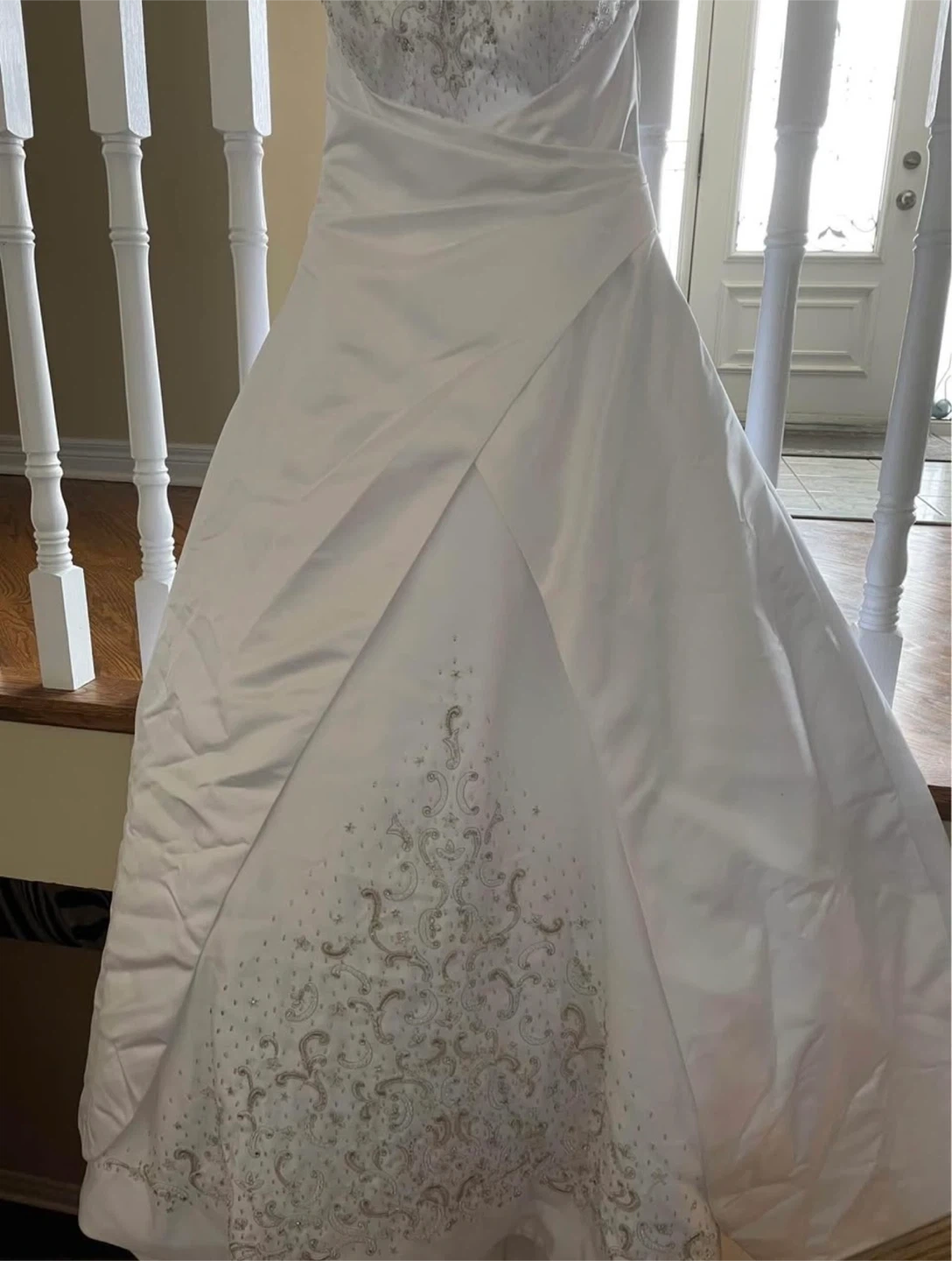 Selling my beautiful Alfred Sung white wedding dress. It features delicate embroidery and a classic look with corseted back and long train.