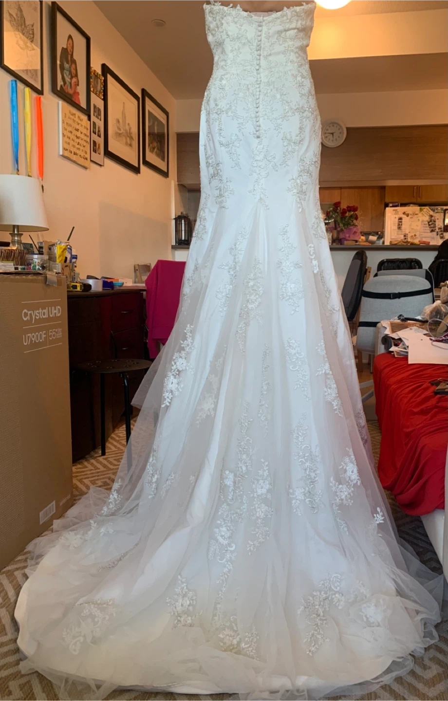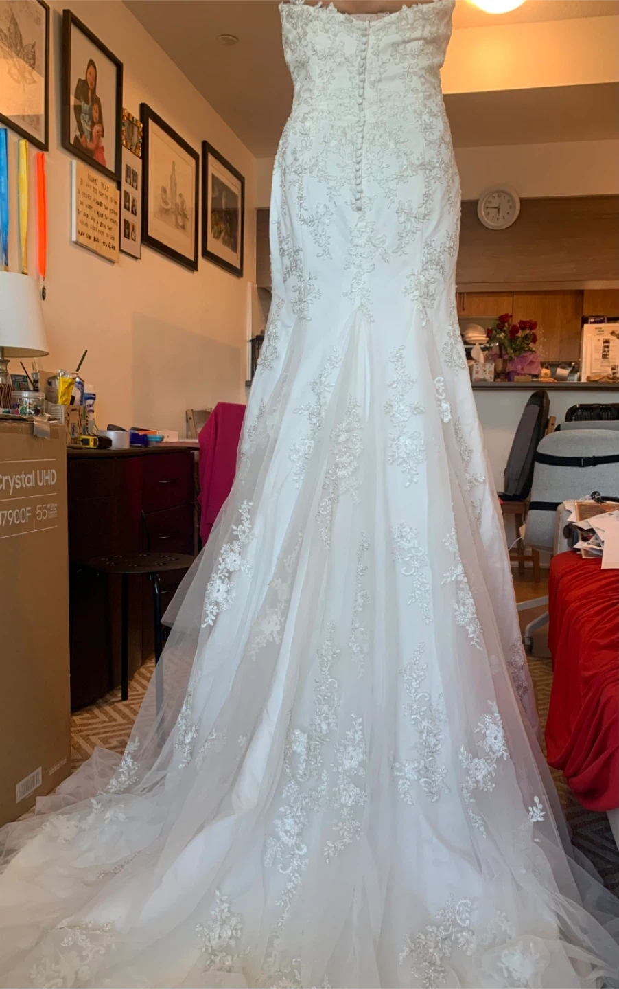 Selling a beautiful white wedding dress. It's in great condition and ready for its next special day! The dress features delicate lace detailing throughout. It’s never worn.