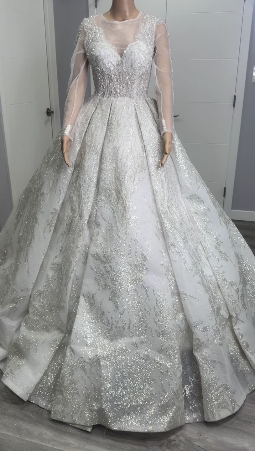 Beautiful white wedding dress with silver detailing. It features long sleeves and a full skirt. Perfect for your special day!