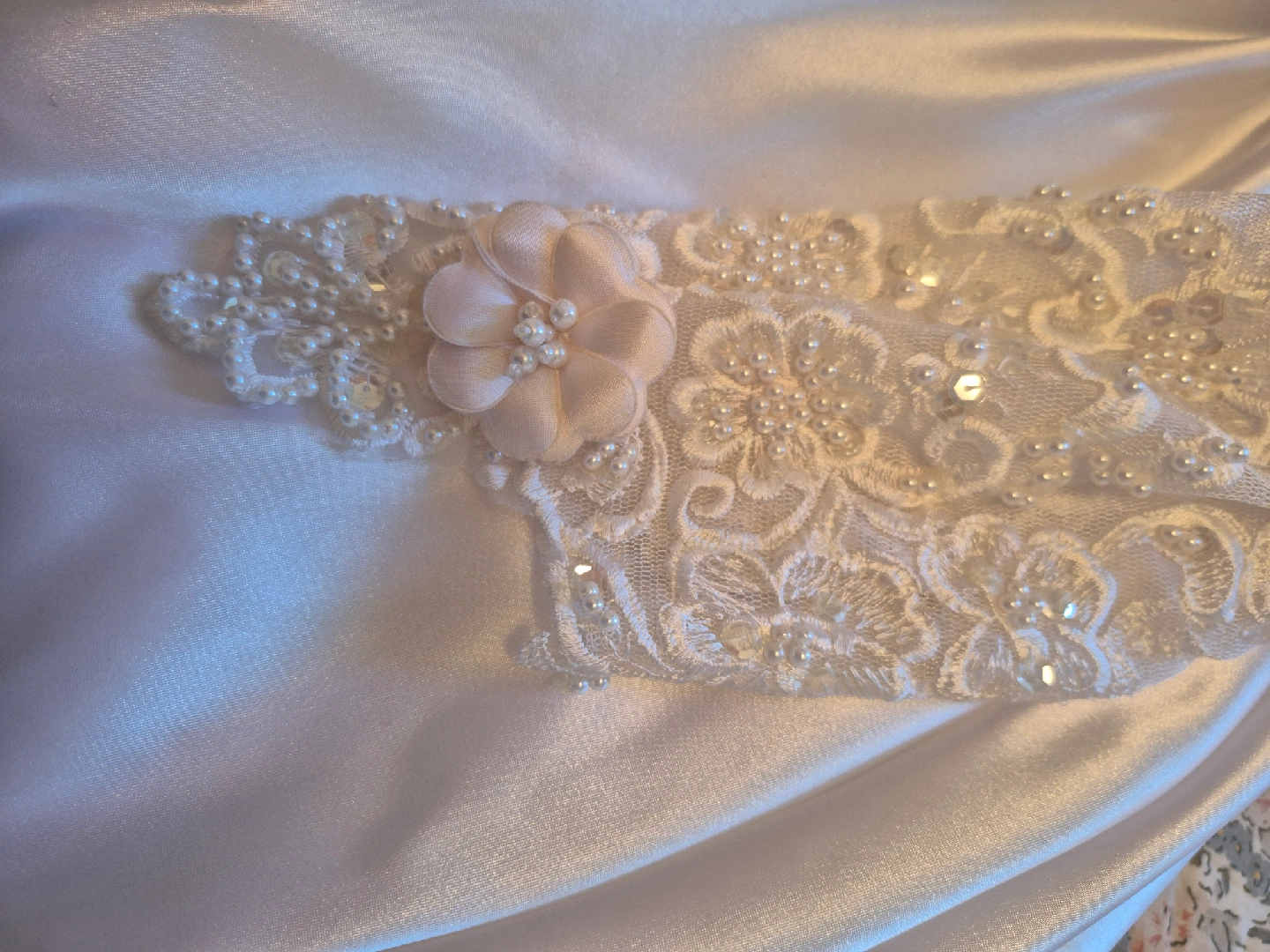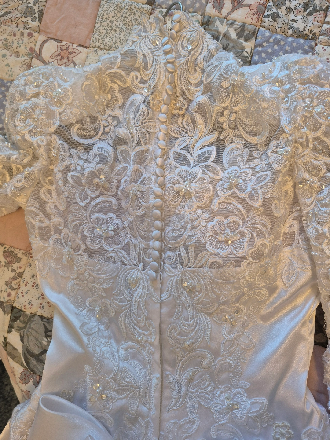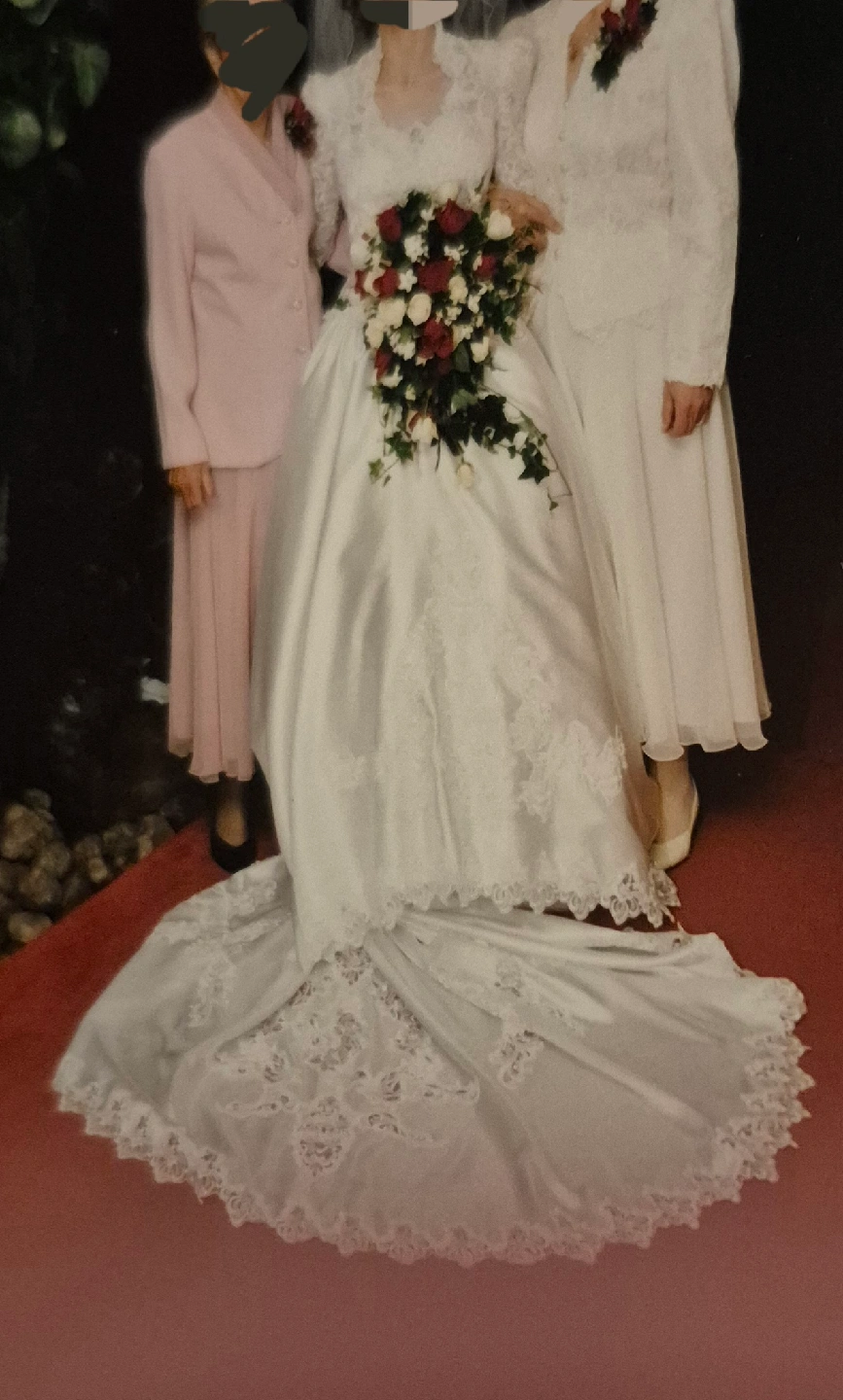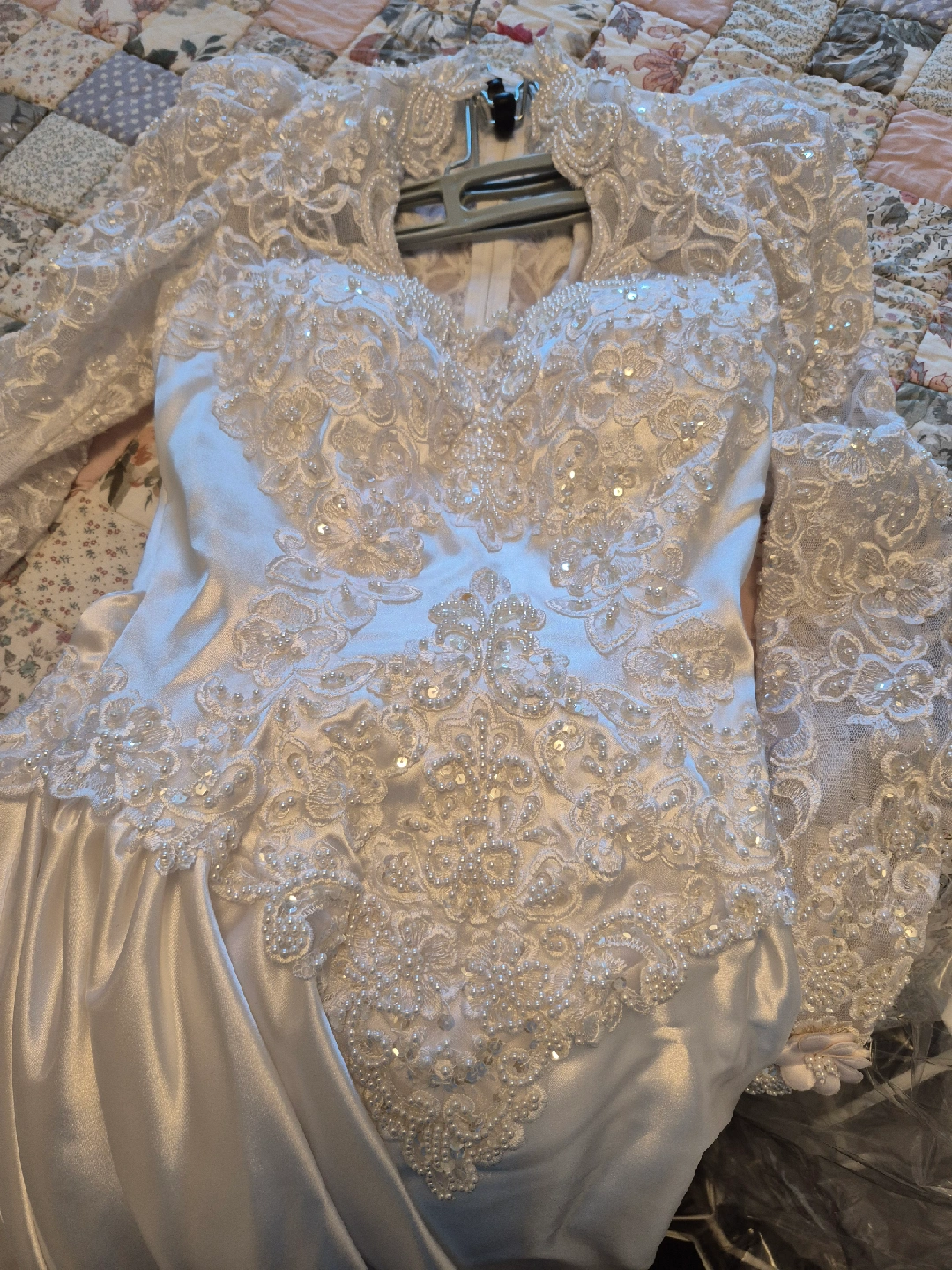 Beautiful wedding dress with intricate lace detailing and a matching hair comb. The dress features delicate floral patterns and pearl accents. The hair comb complements the dress perfectly, adding a touch of elegance to your special day