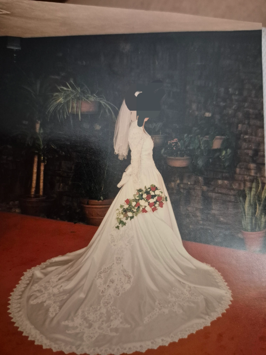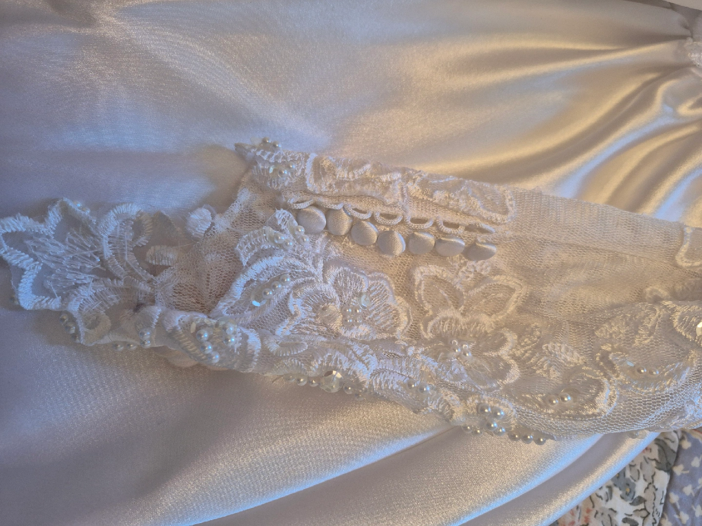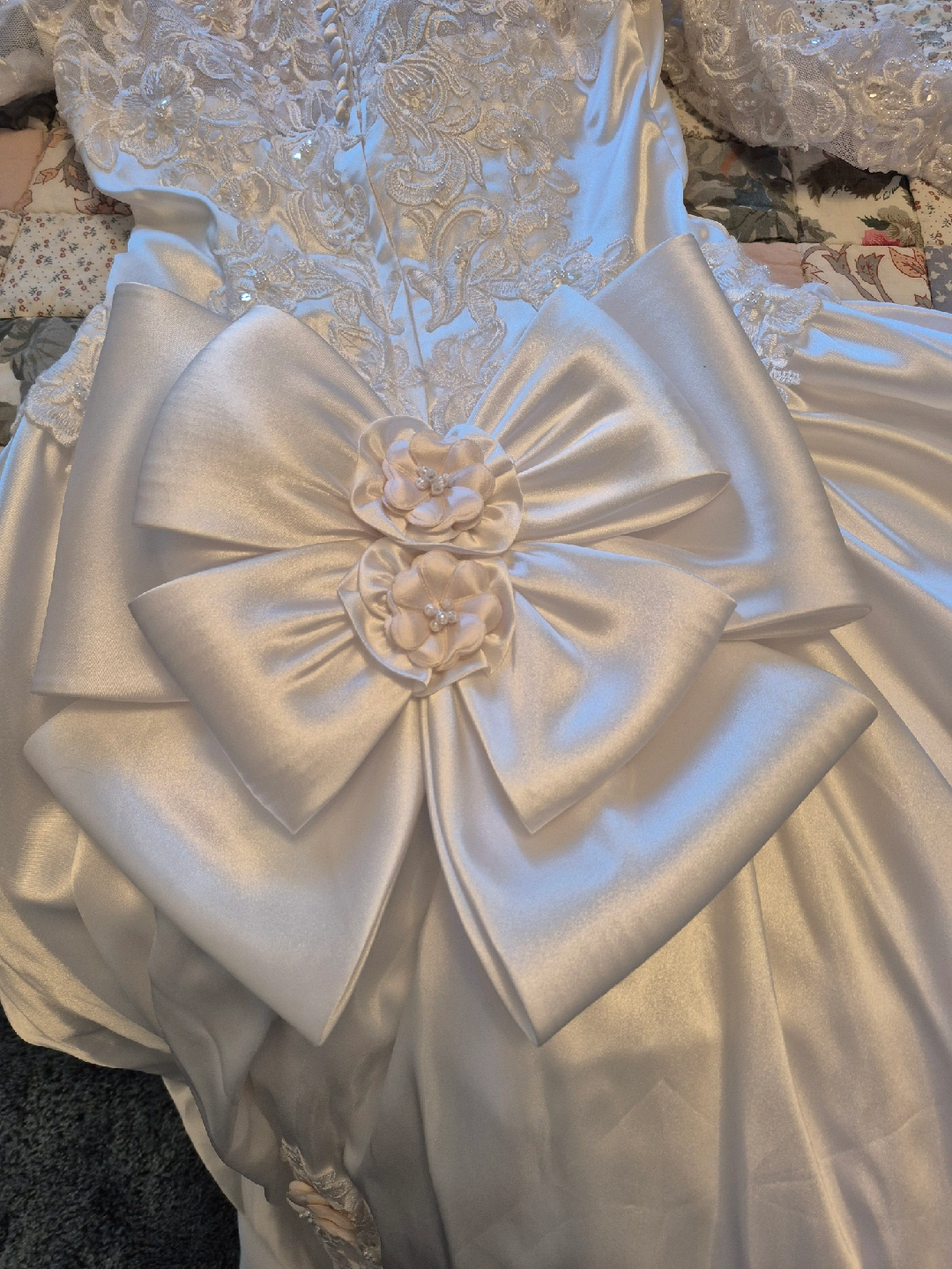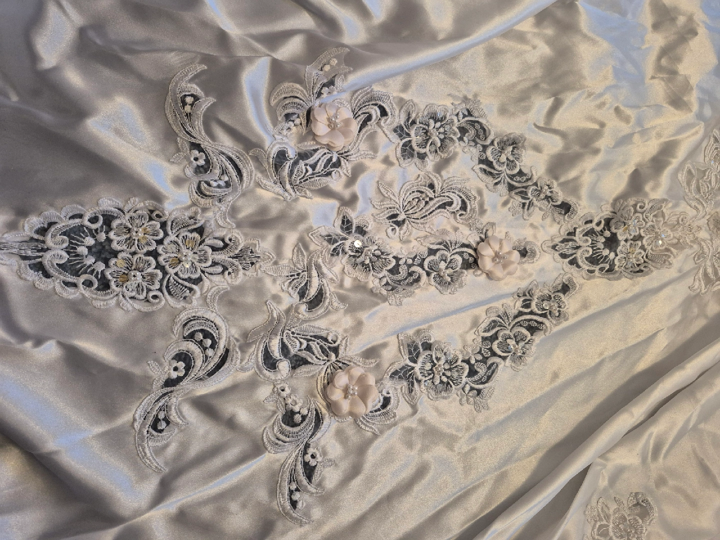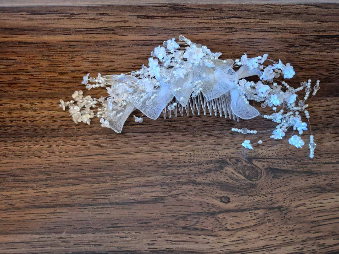 Beautiful wedding dress with intricate lace detailing and a matching hair comb. The dress features delicate floral patterns and pearl accents. The hair comb complements the dress perfectly, adding a touch of elegance to your special day