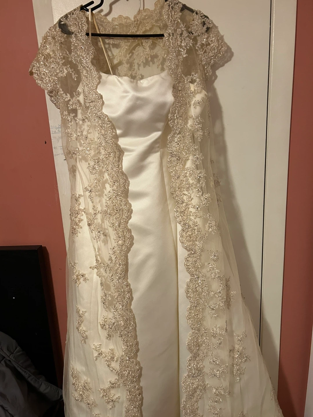 Selling a wedding dress with a beautiful lace overlay. It's a classic design, perfect for your special day. Please note that there are some stains on the dress. Needs to be dry cleaned. Stored in a smoker house.