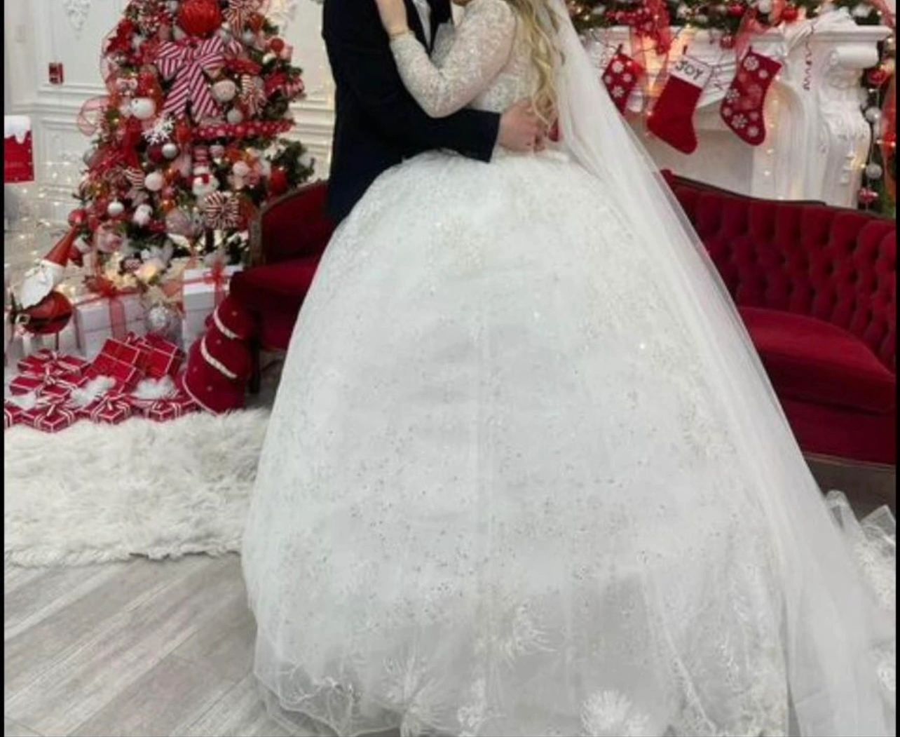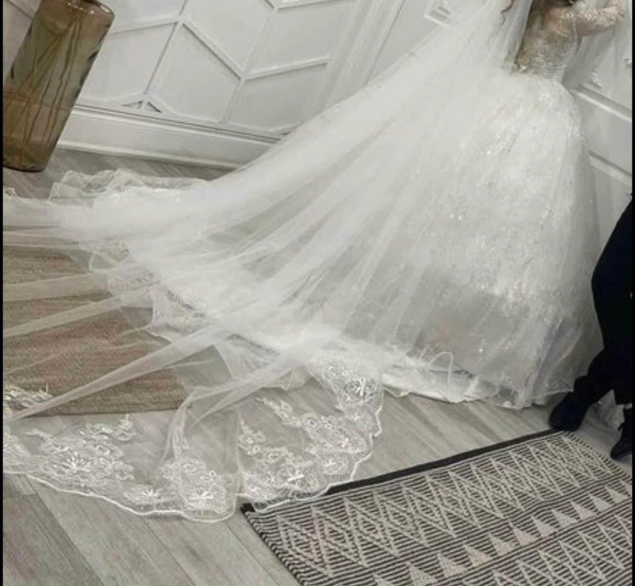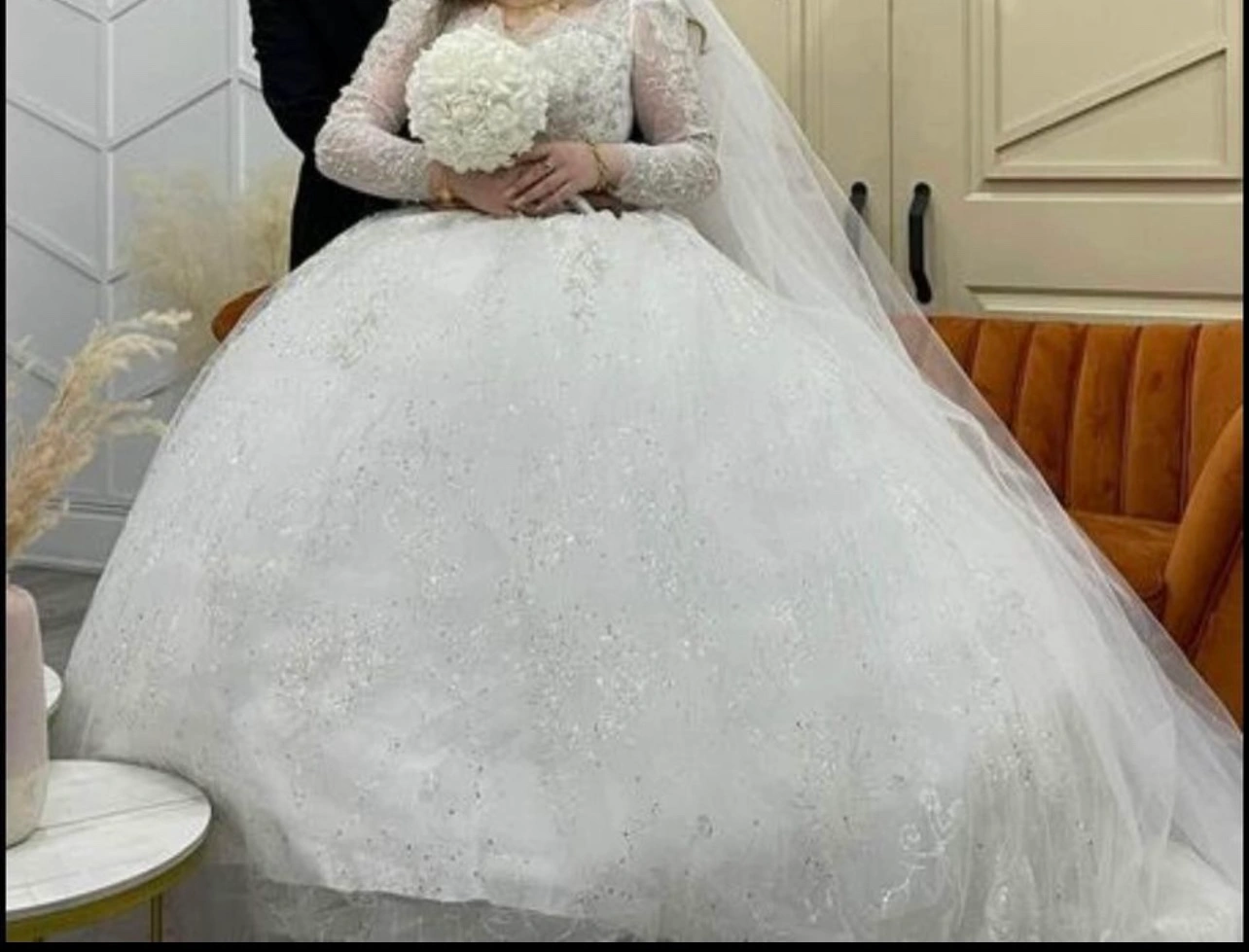 Beautiful wedding dress with long veil and lace detailing. A true princess look! It’s used just 2 hours for photograph indoor. It seems new. If you have any questions, message me!