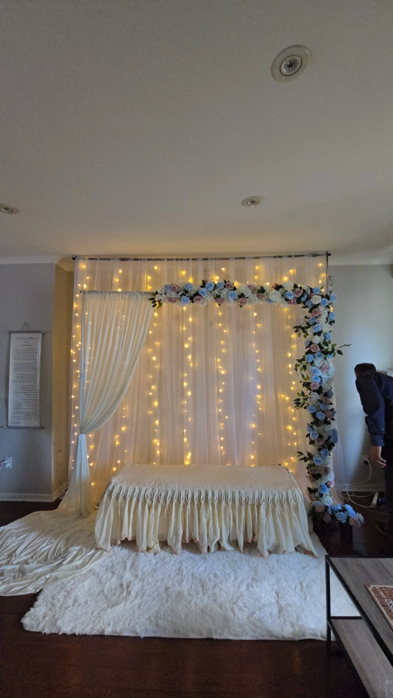 Renting a beautiful wedding backdrop, perfect for creating a magical atmosphere! It includes sheer curtains, fairy lights, and delicate floral arrangements in soft blues and pinks. This backdrop is sure to add a touch of elegance to your special day