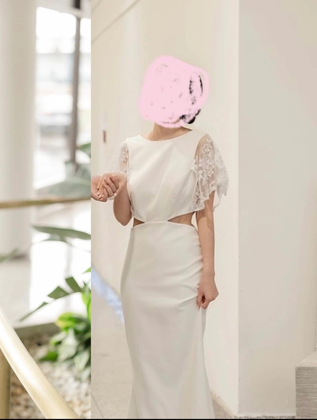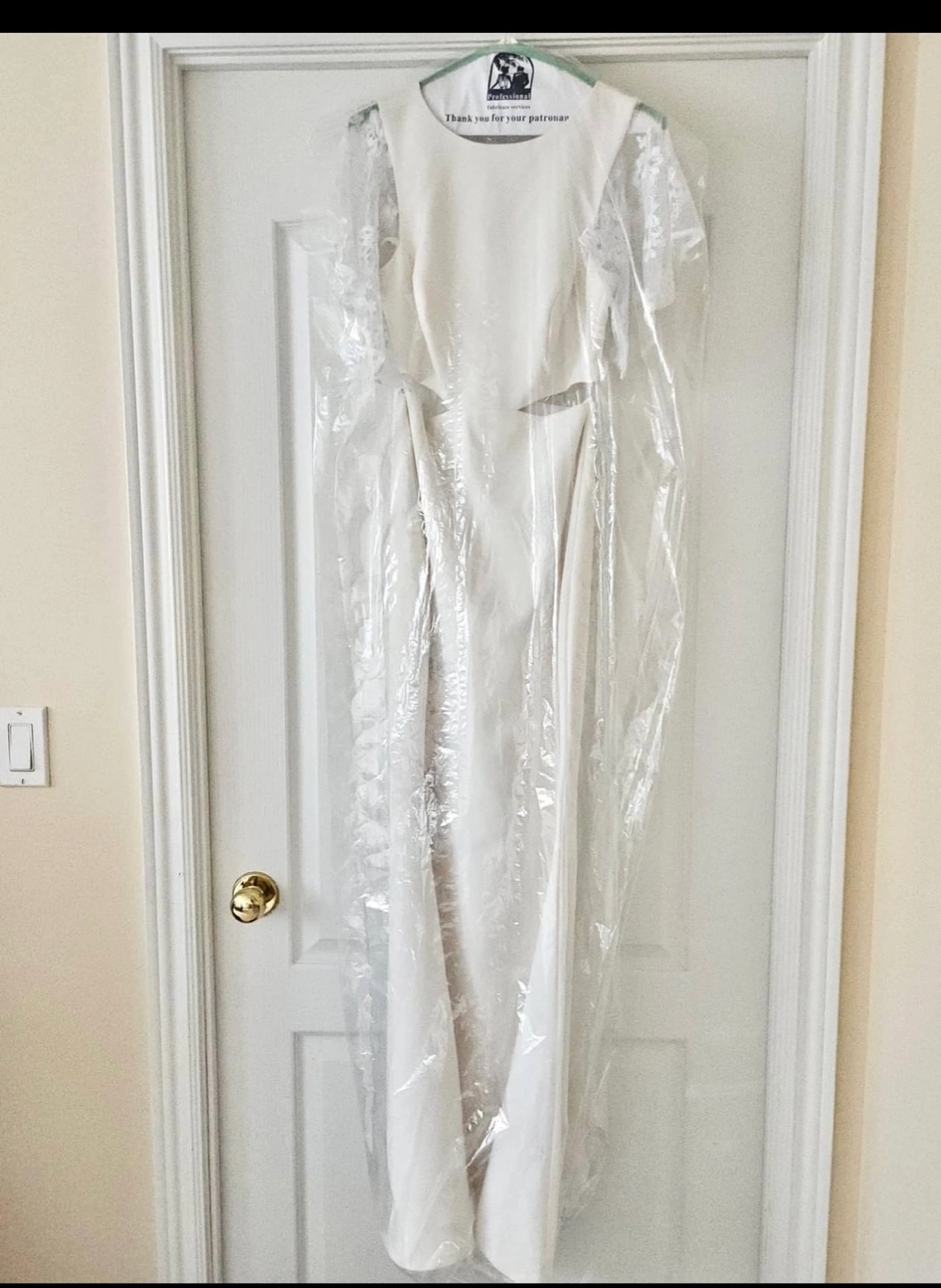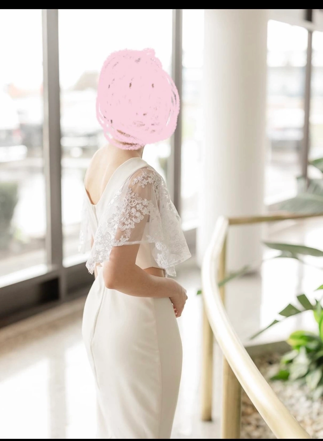 Elegant floor-length gown made in Montreal. Features a cutout design and lace detailing on the sleeves. Fitted silhouette. Perfect for a wedding reception or small wedding. Worn only once and dry cleaned.
