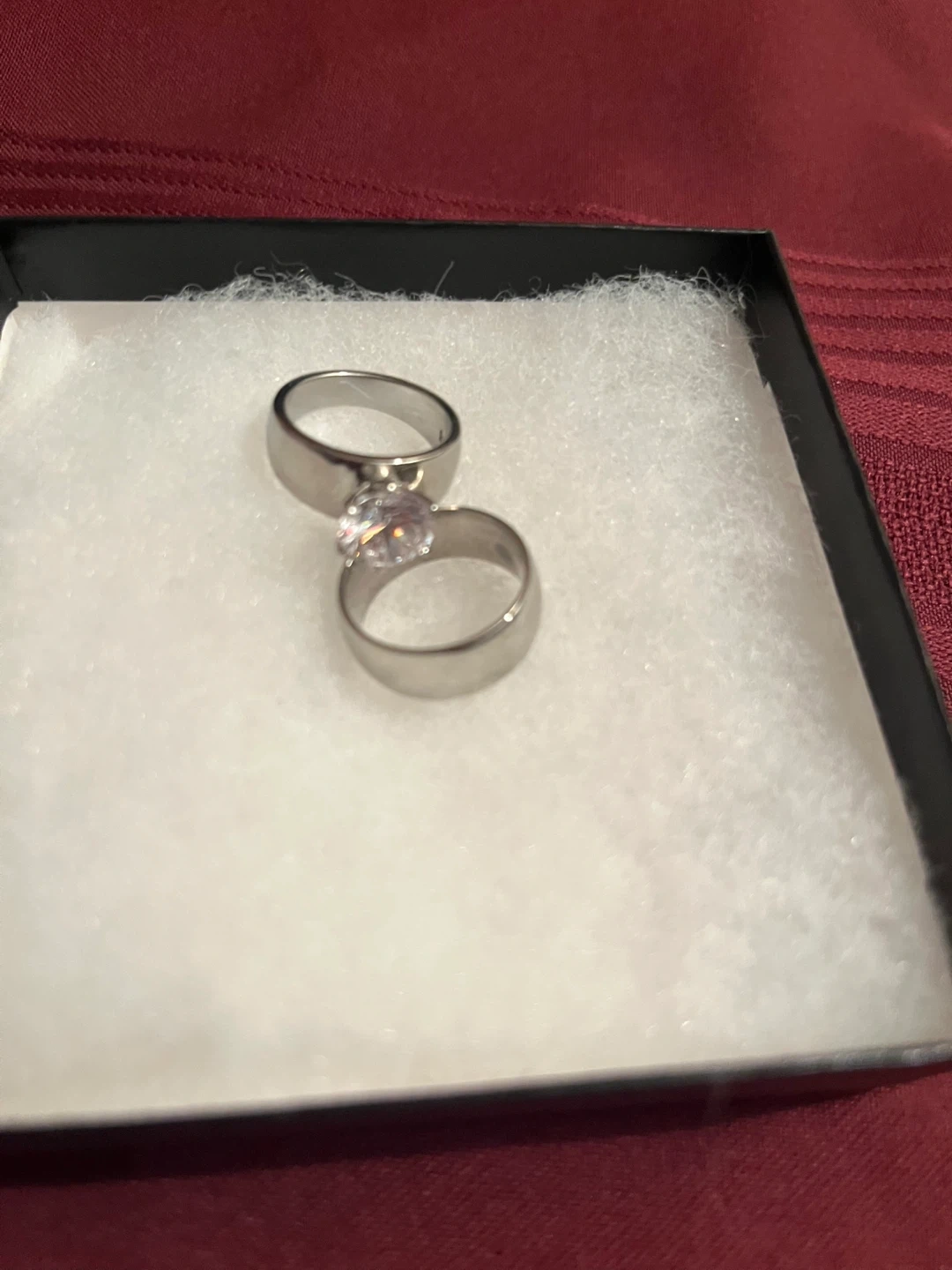 88Selling a wedding ring set. The rings are silver in colour and appear to be in good condition. Perfect for a wedding or engagement! These are stainless steel in materials.
