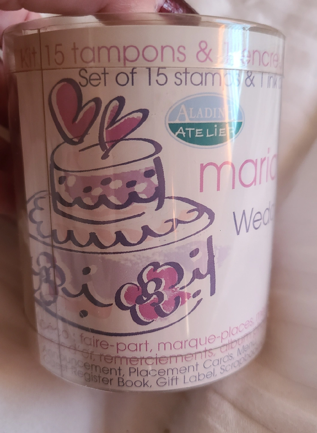 21Selling a set of 15 stamps and inkpads from Aladine Atelier. The set is designed for wedding-themed crafts and scrapbooking. Perfect for creating cards, announcements, and more!