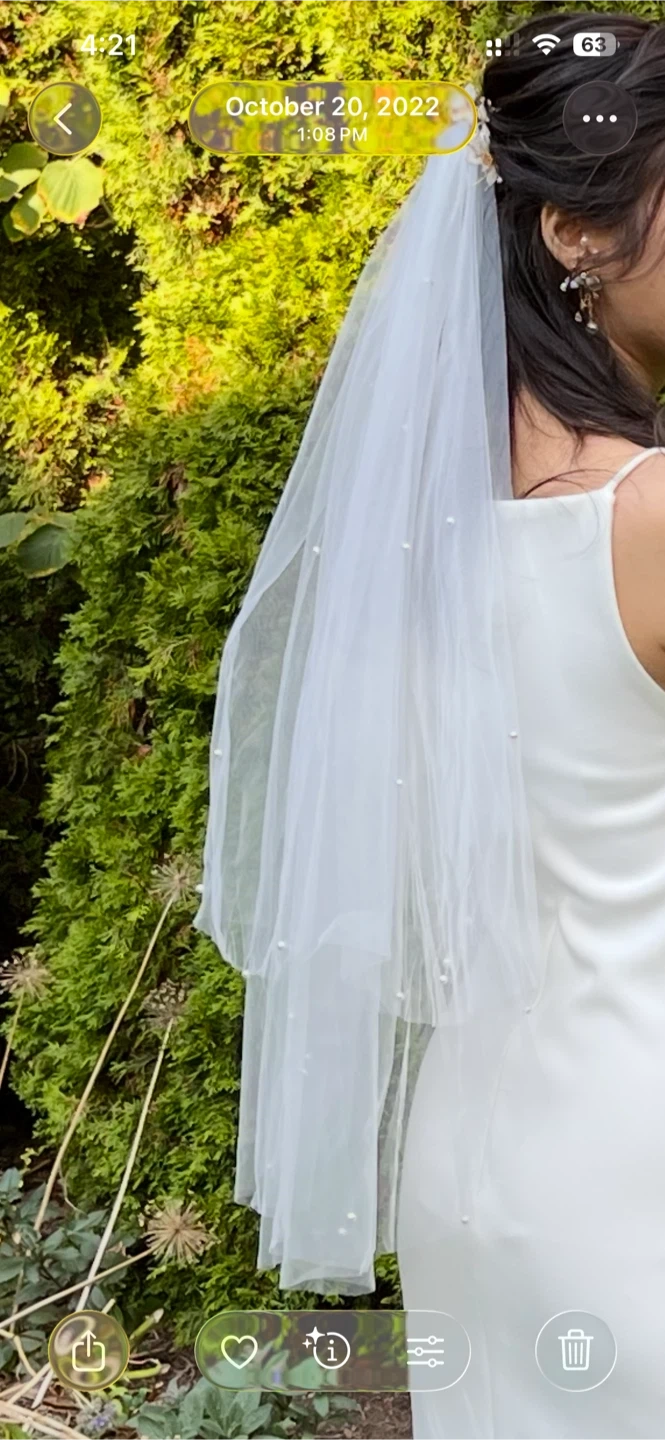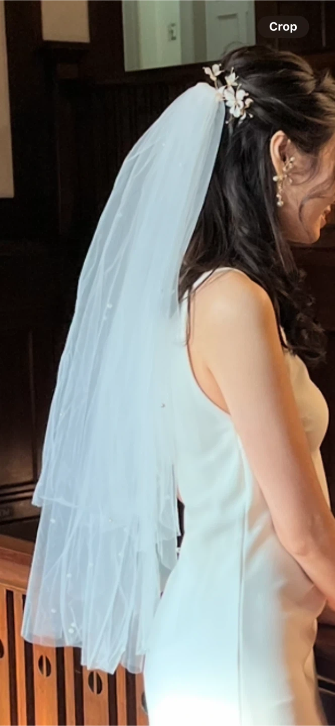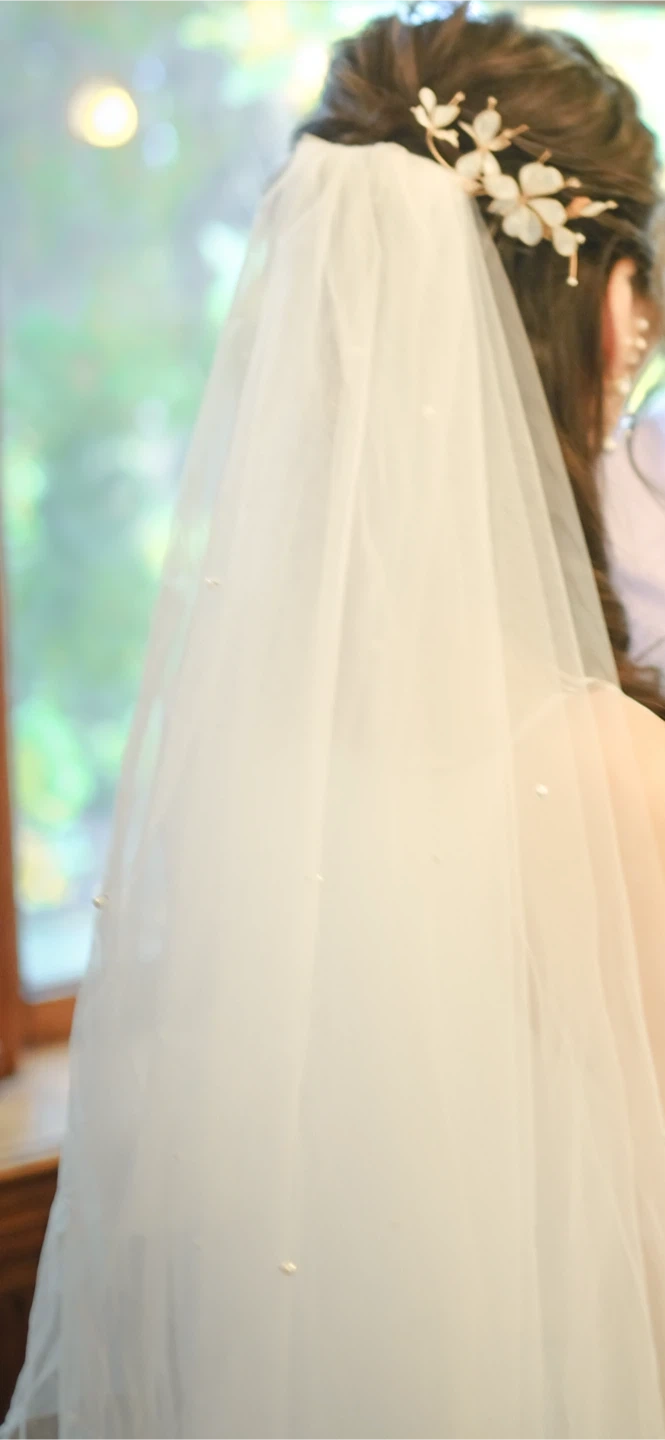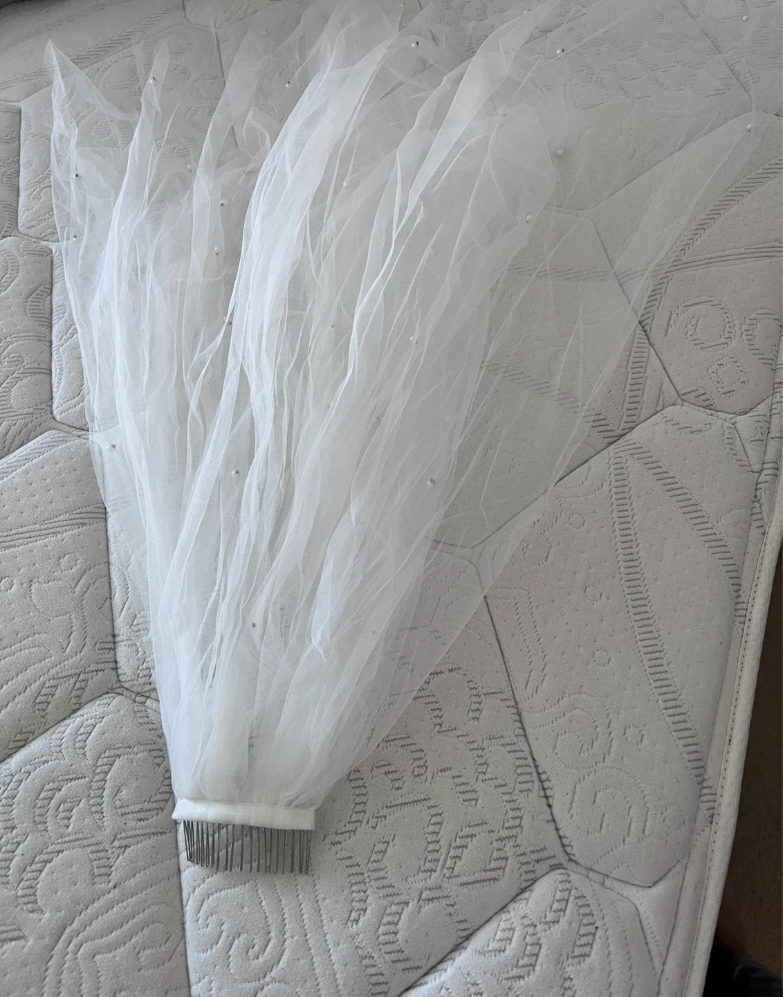 Selling a beautiful wedding veil! It's a classic style with delicate pearl accents. Perfect for adding a touch of elegance to your special day. It's in great condition