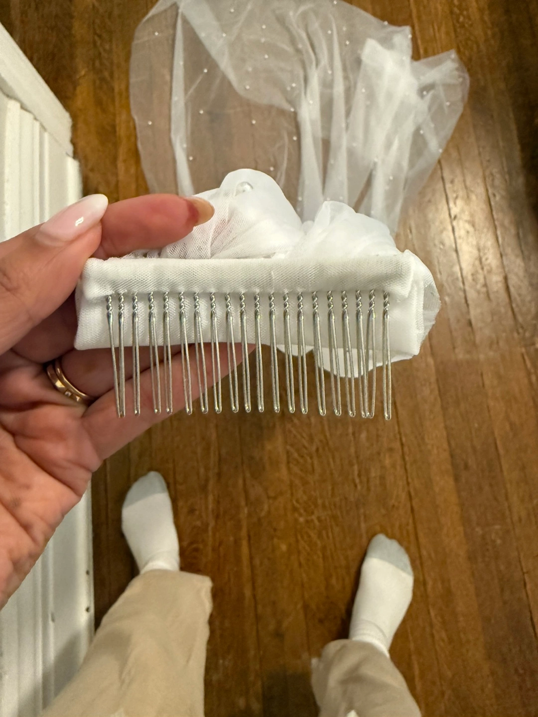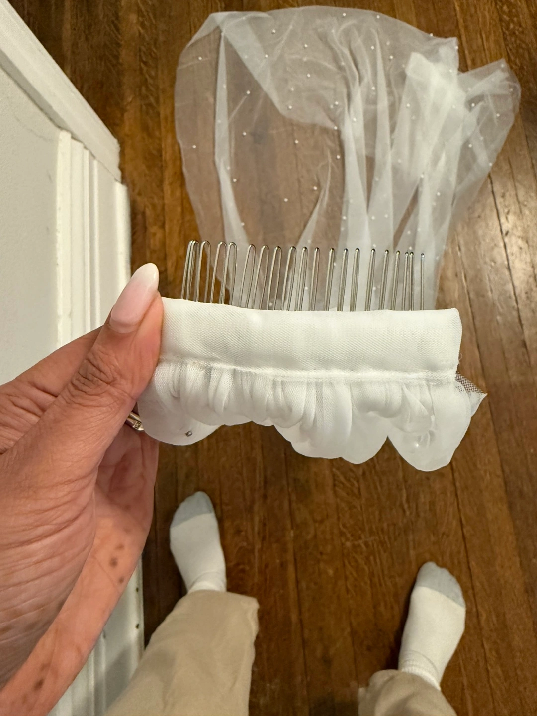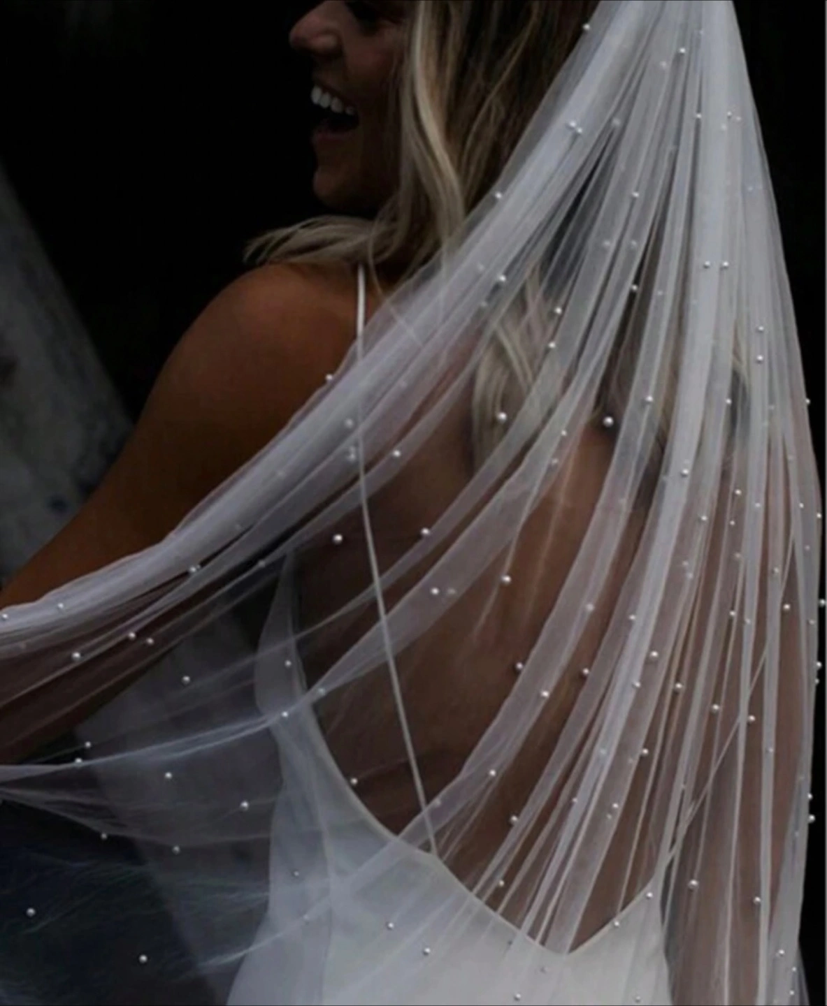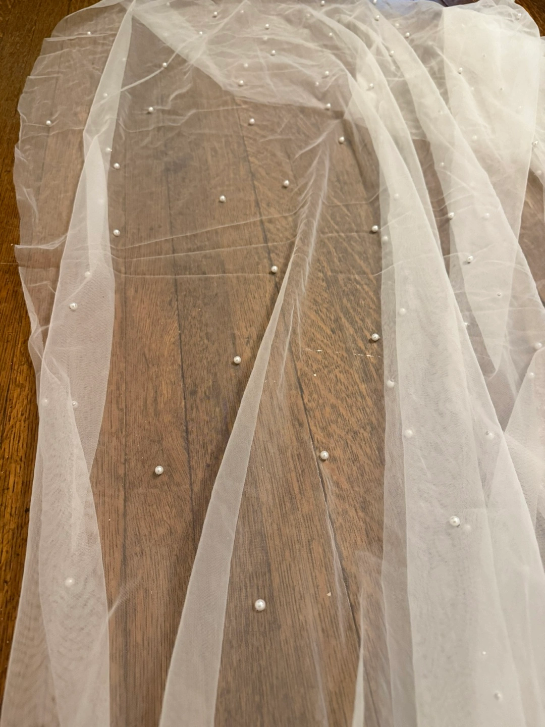 28Selling a beautiful wedding veil. It's a lovely white colour and features delicate pearl accents. Perfect for adding a touch of elegance to your special day! White Pearls scattered across veil Super soft tulle 1 layer 200 cm long