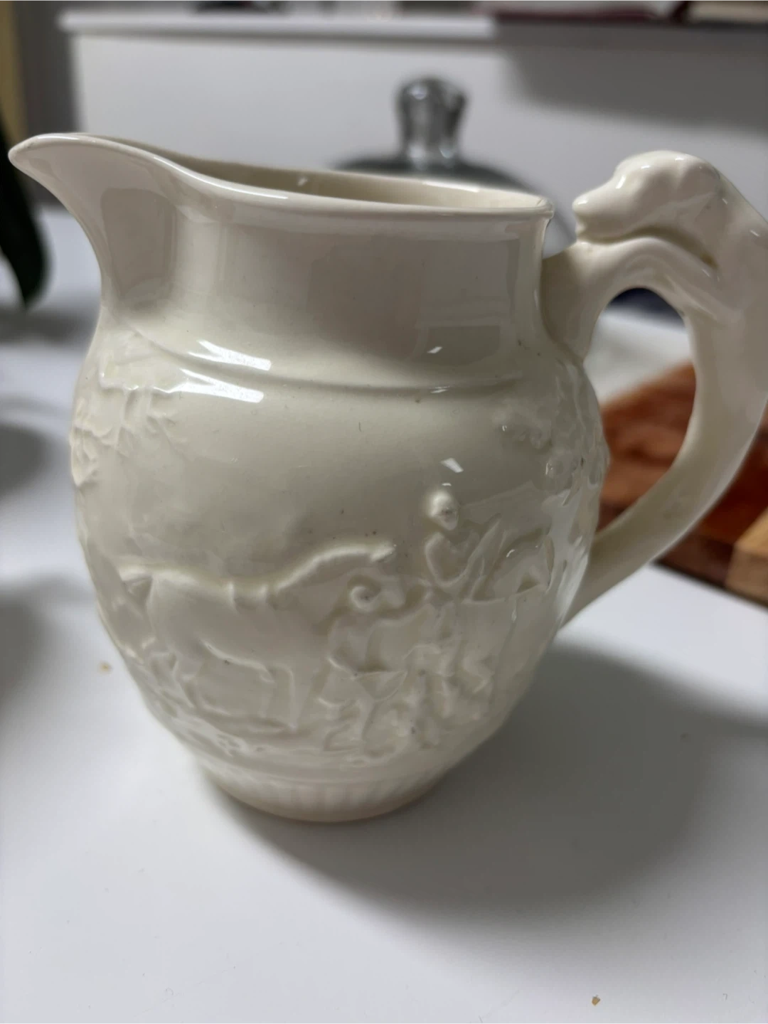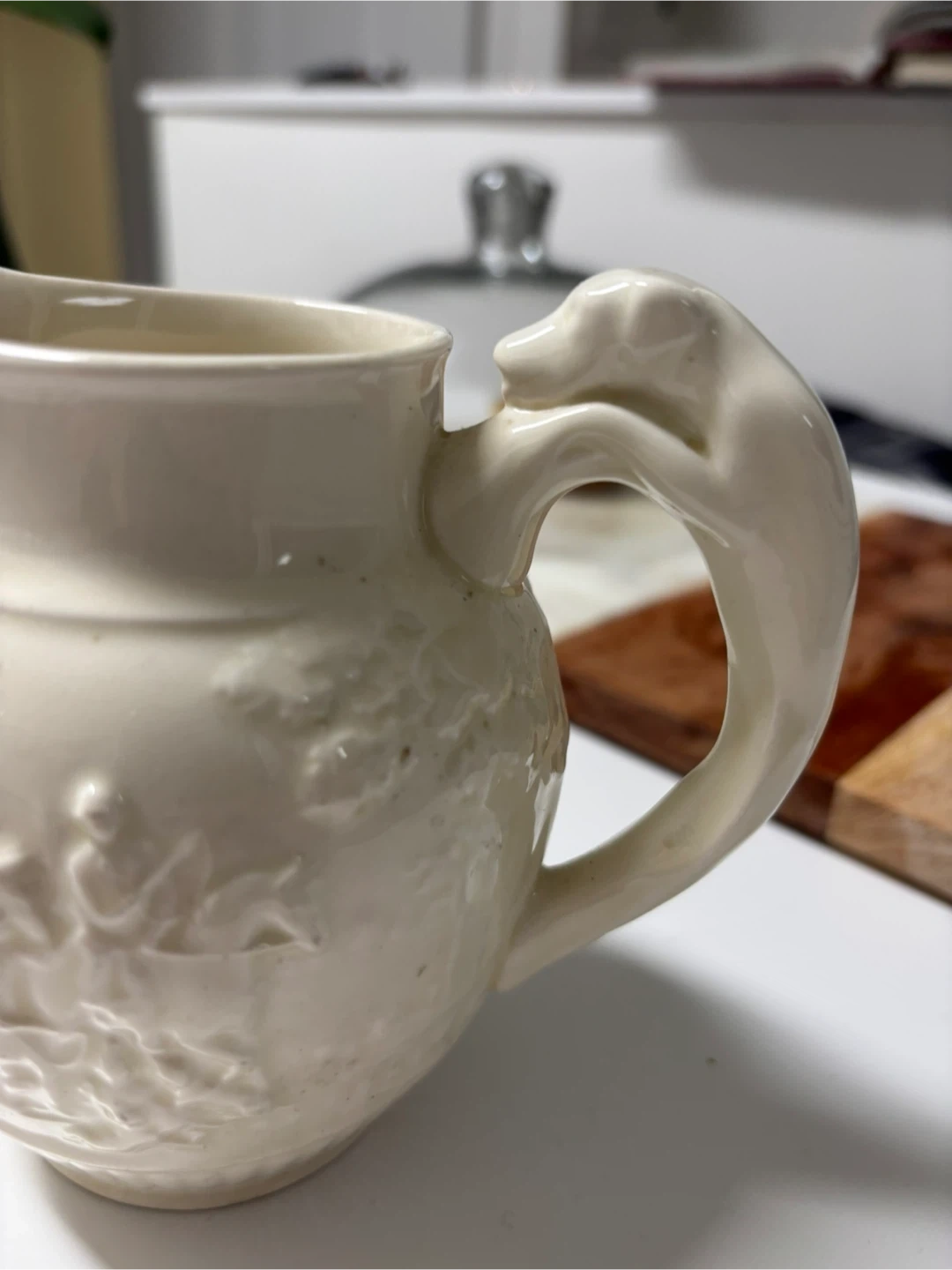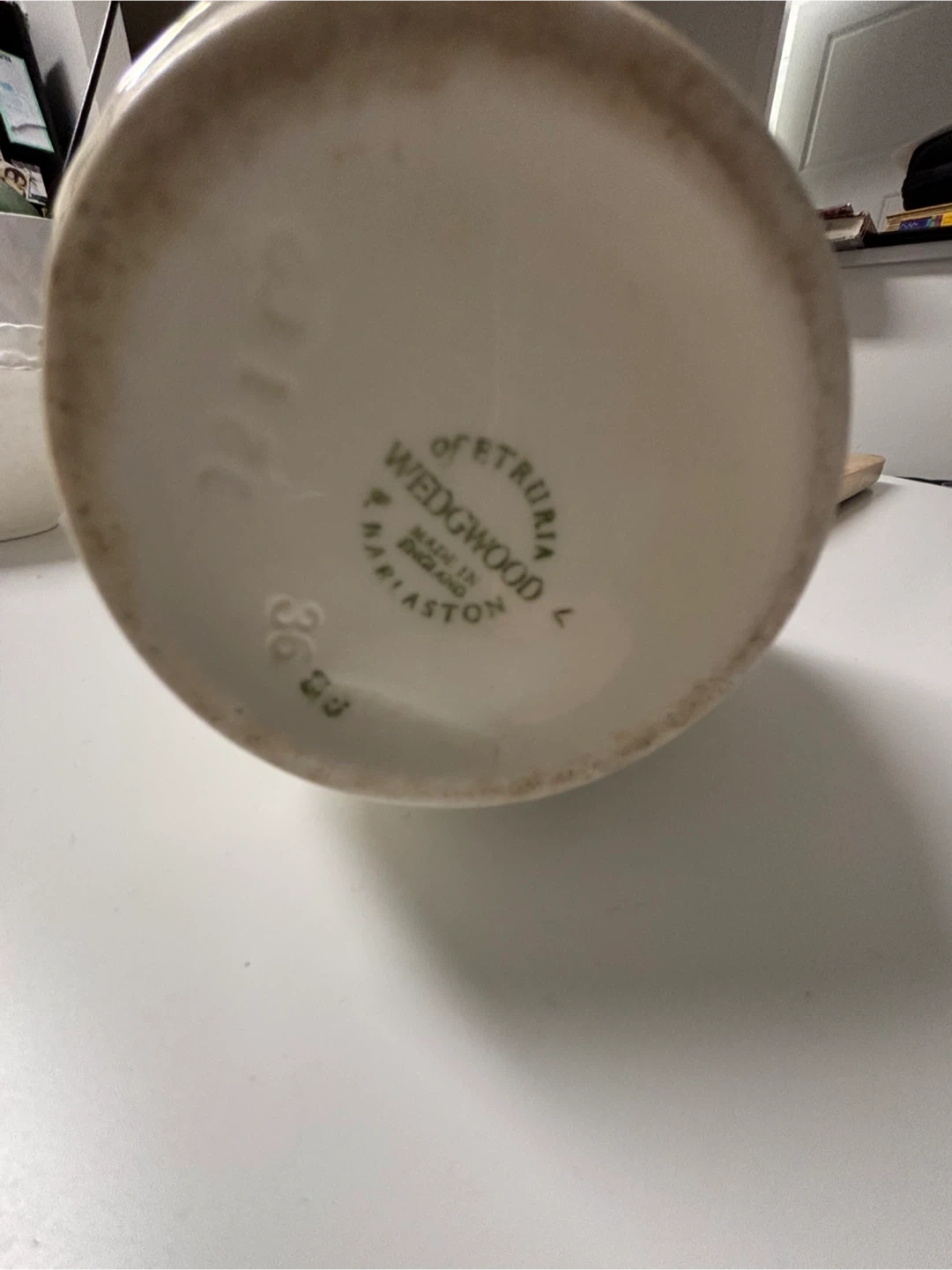 10Selling a lovely Wedgwood creamer, marked 'of Etruria' and 'Made in England'. It features a unique handle and decorative details. Perfect for adding a touch of elegance to your table!