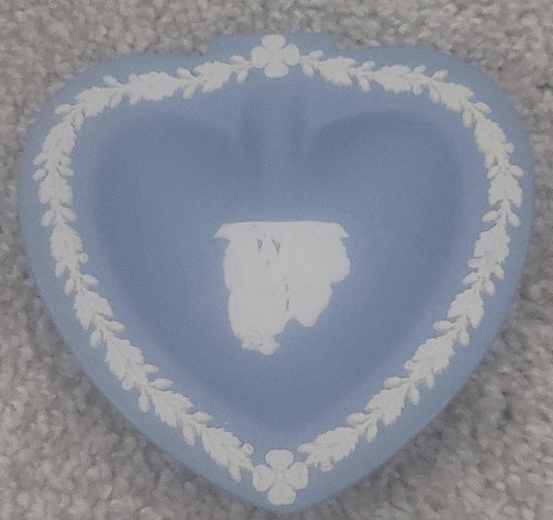 10A lovely Wedgwood pale blue jasper heart-shaped trinket dish! It features a white bas-relief design in the center and a decorative border. Perfect for holding small jewelry or as a decorative piece could use a clean