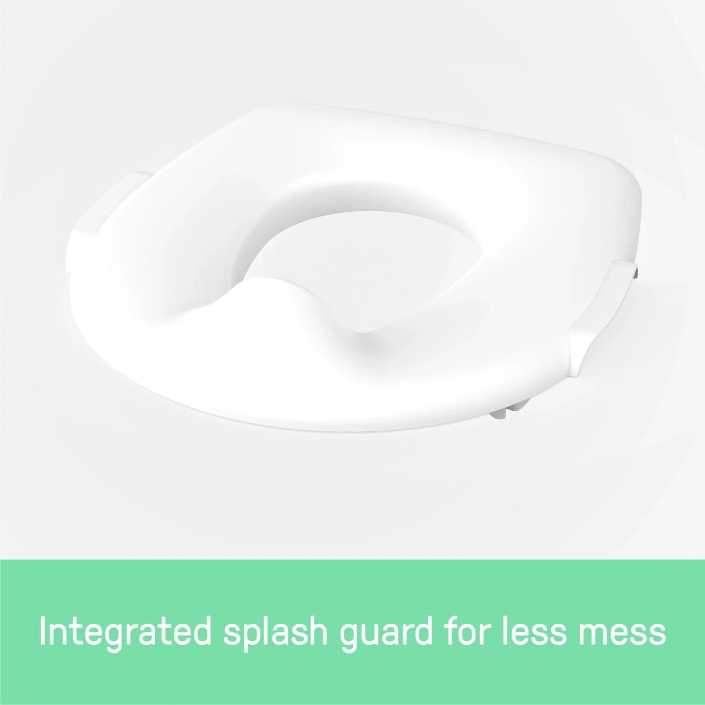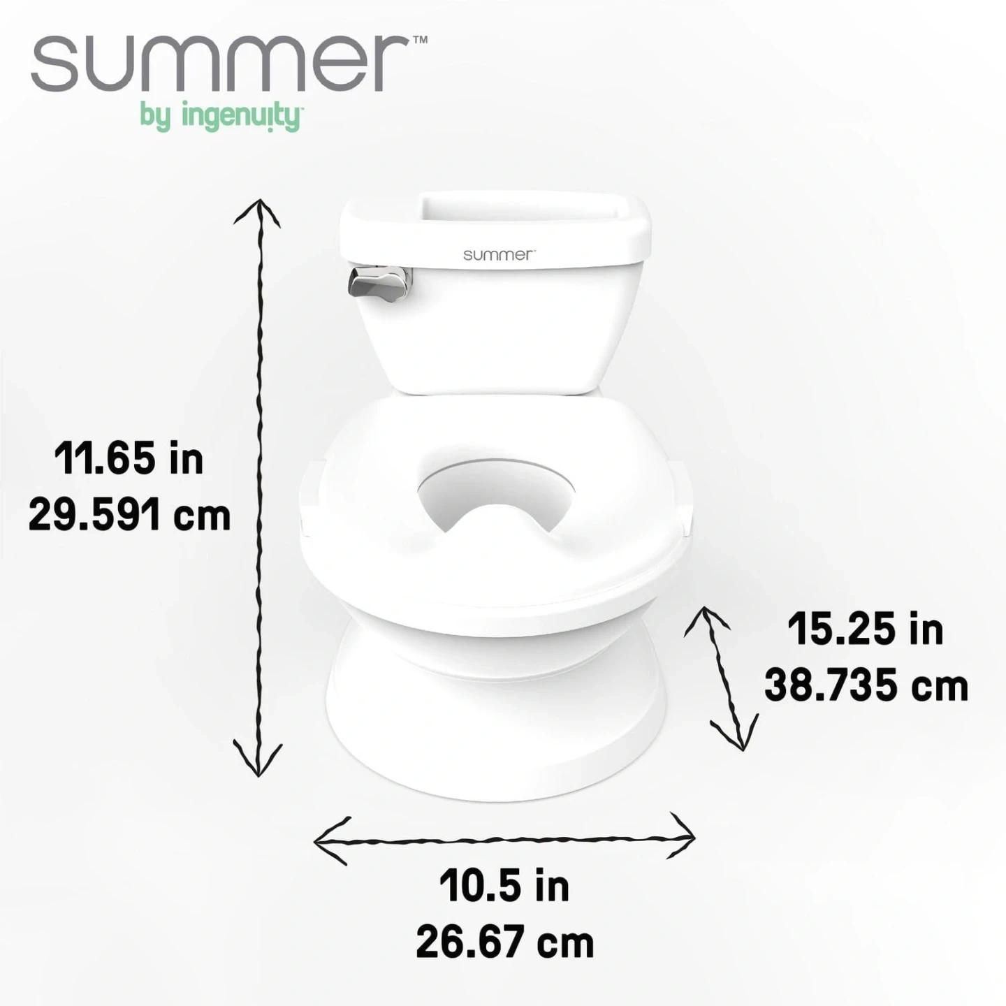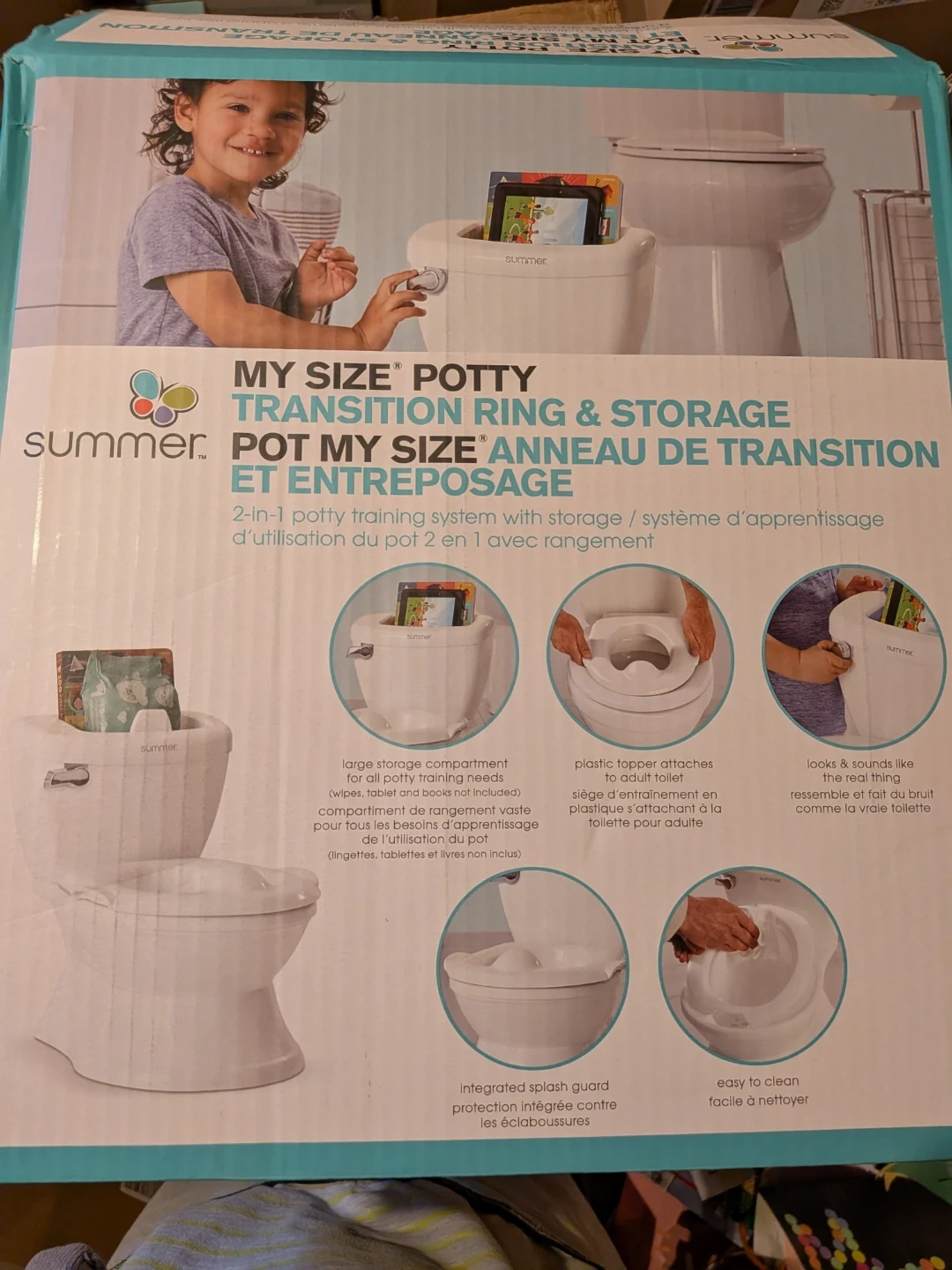 2-in-1 potty training system. Has large storage compartment for wipes n books. Converts to a plastic topper for adult toilet too. Makes real toilet sounds for fun. Integrated splash guard is great for less mess. Super easy to clean.