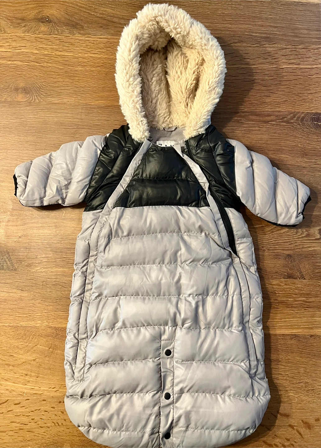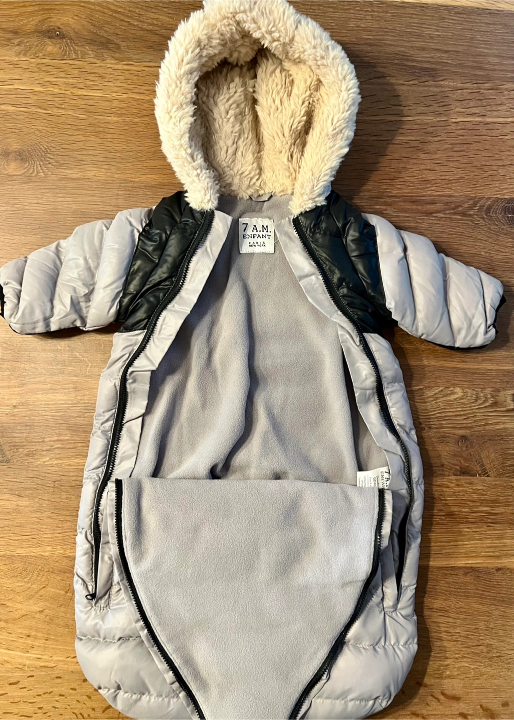 Gently used 7AM Enfant Doudoune. Labeled as 0-3 months. Been looking for the ultimate versatile snowsuit for baby? Your search ends here. The water-repellent Doudoune marries modern style with innovative materials and design. Your little bundles of joy need to stay warm is here: an extra-toasty faux fur–lined hood, faux down insulation, built-in hand covers, soft microfleece lining, and convenient split-leg design for easy changes. Includes removable scarf.