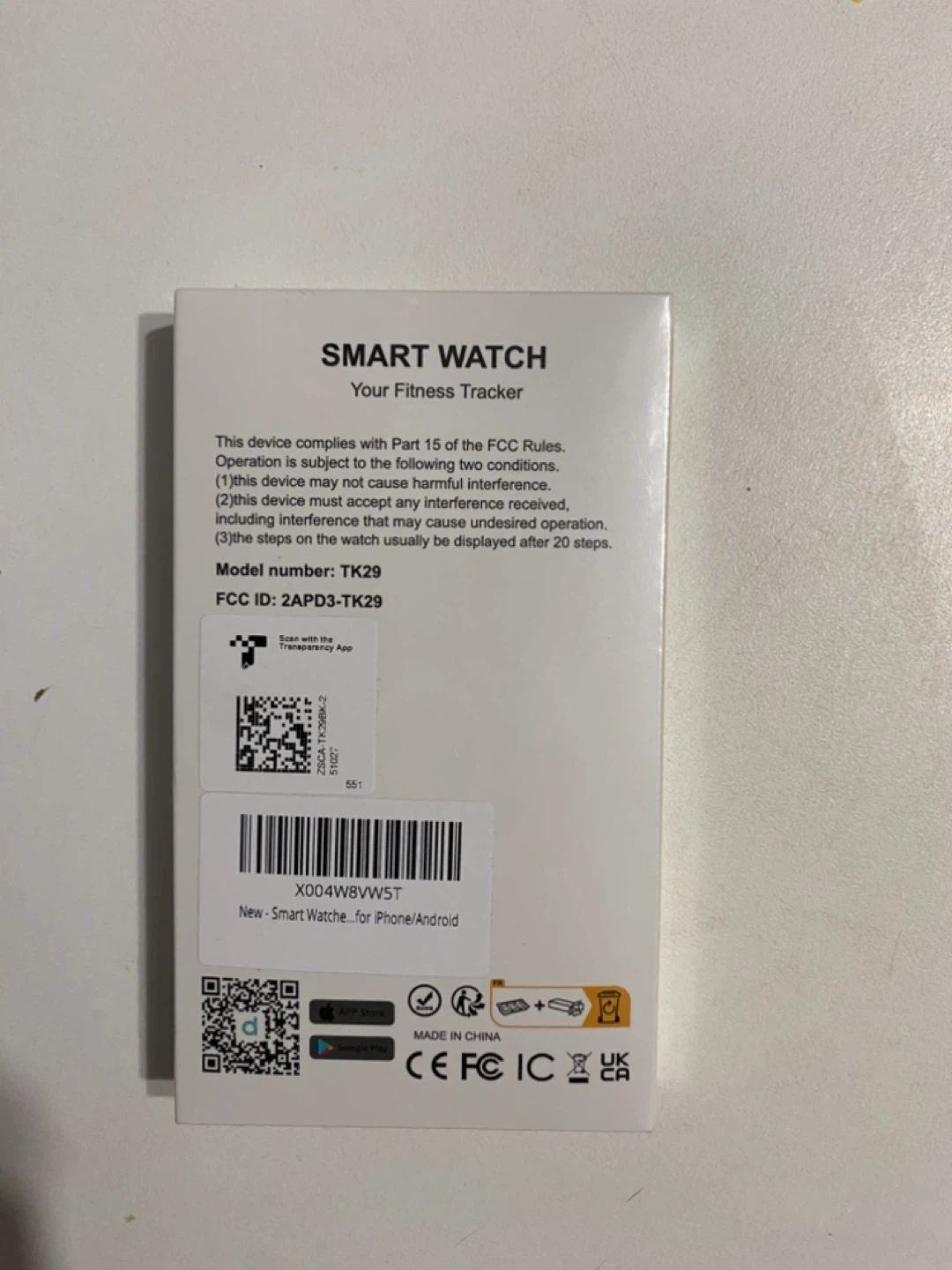 Selling a brand new Smart Watch, your fitness tracker! It comes in its original box and monitors sleep, steps, calories, and colour. It also has telephone dialing, message, motion, alarm clock, and telecontrol photograph functions. The model number is TK29.