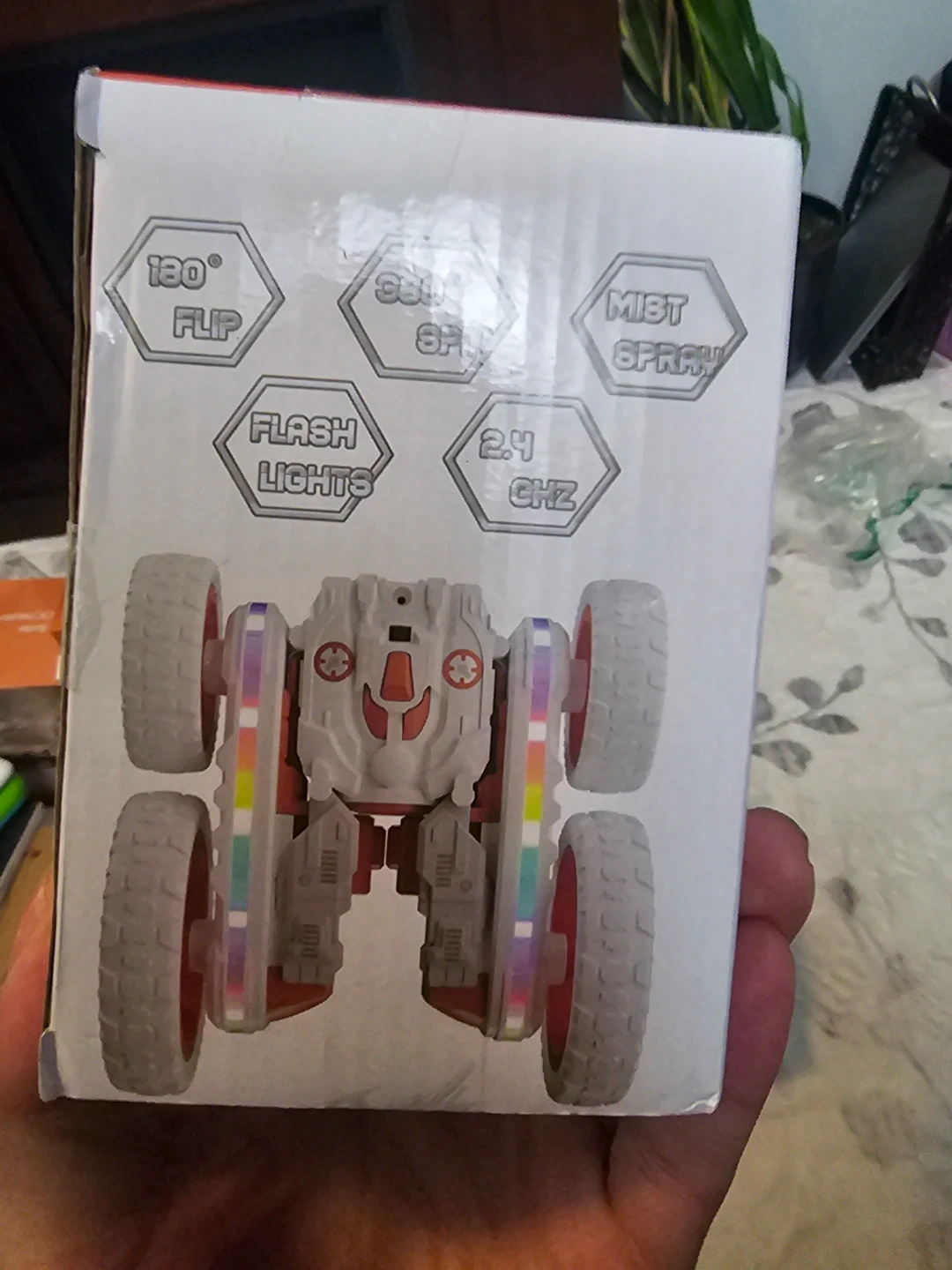 This remote control stunt car performs 180-degree flips and 360-degree spins. It features flash lights and a mist spray function. The car uses a 2.4 GHz frequency for control. It's a fun toy for kids who enjoy action vehicles!