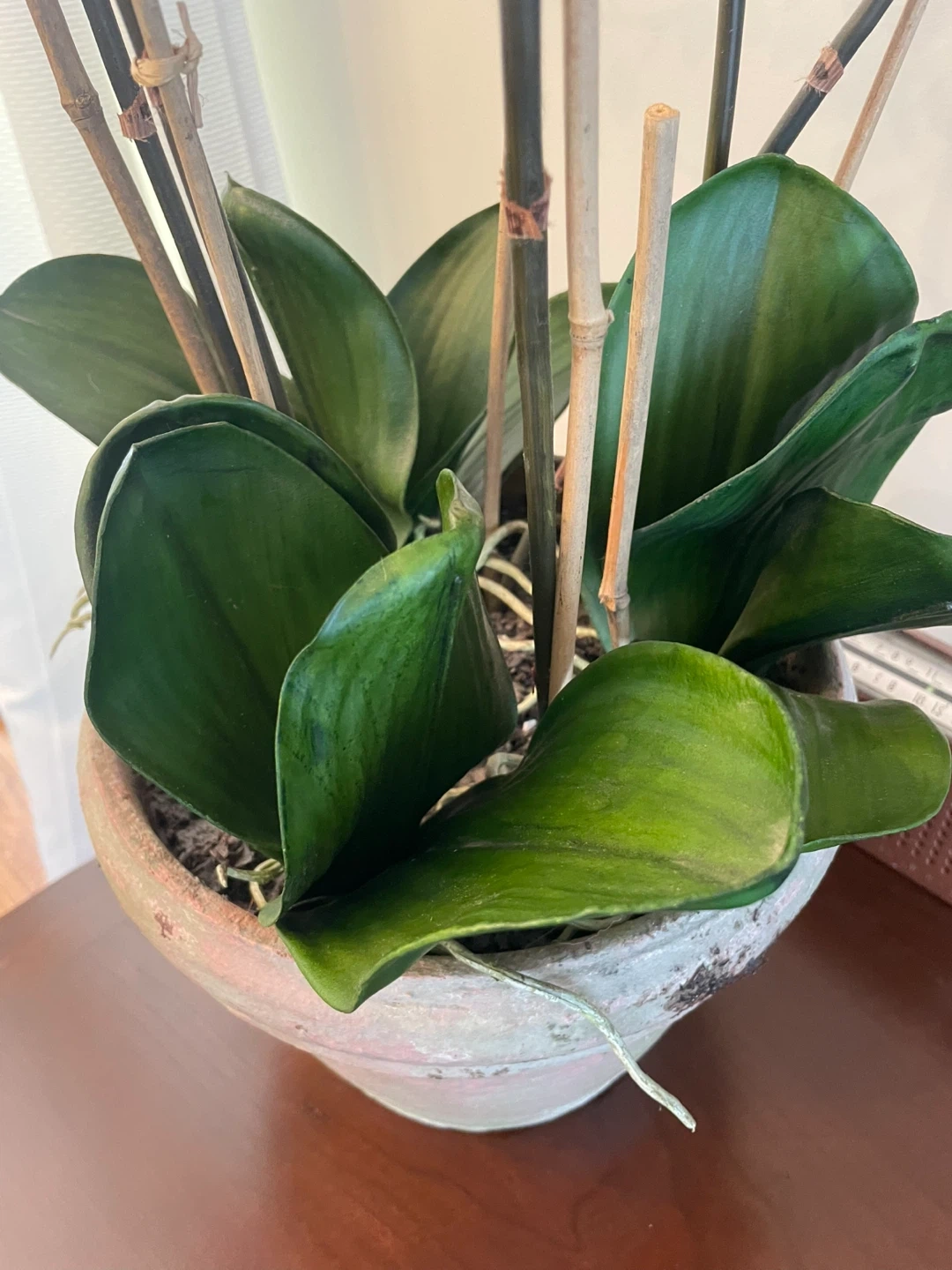 This artificial orchid plant features vibrant red blooms and realistic green leaves. It's housed in a distressed, grey and pink terra cotta-style pot with bamboo stakes for support. A lovely decorative accent for any home!