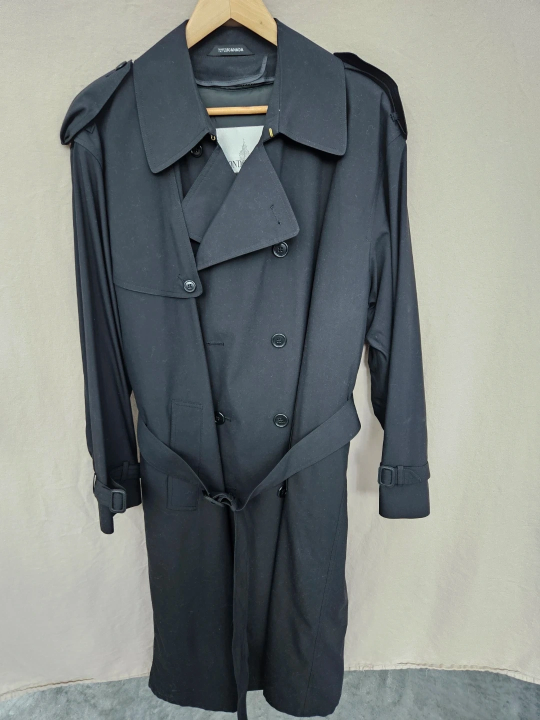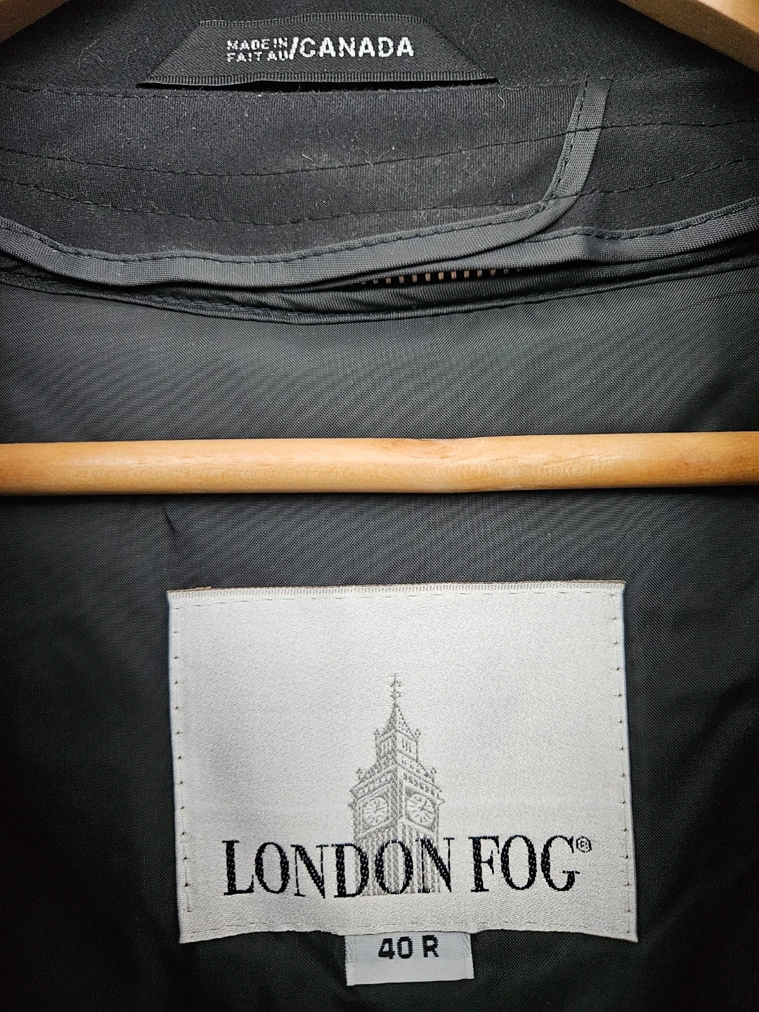 Like new - Classic black London Fog trench coat. Treated for water repellency. Machine washable for easy care.