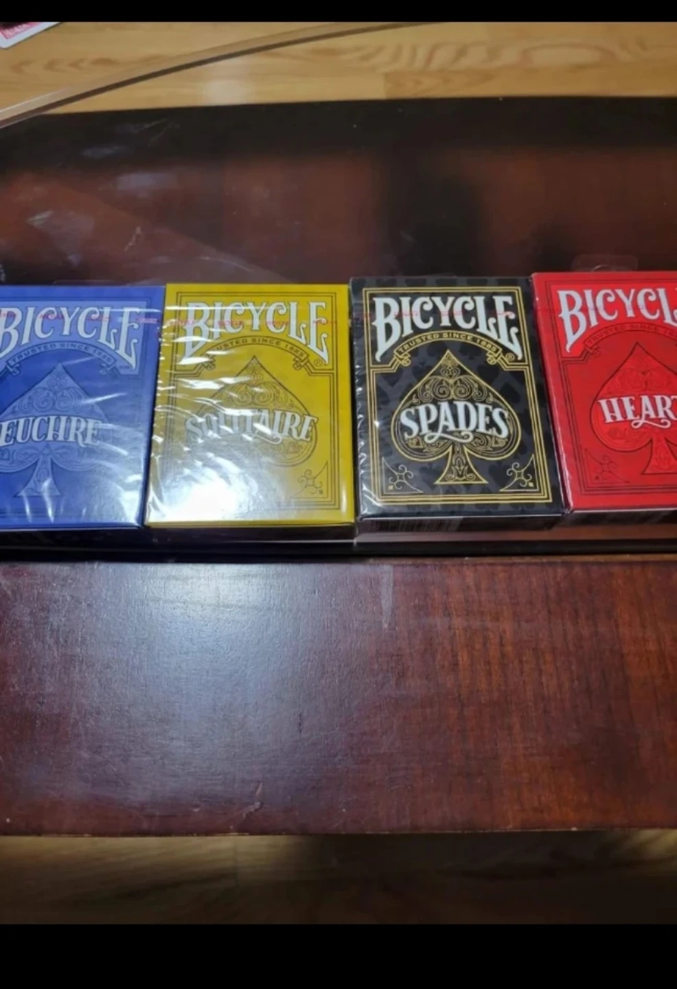 Selling four decks of Bicycle playing cards. Includes Euchre, Solitaire, Spades, and Hearts editions. All decks are sealed and in brand new condition.