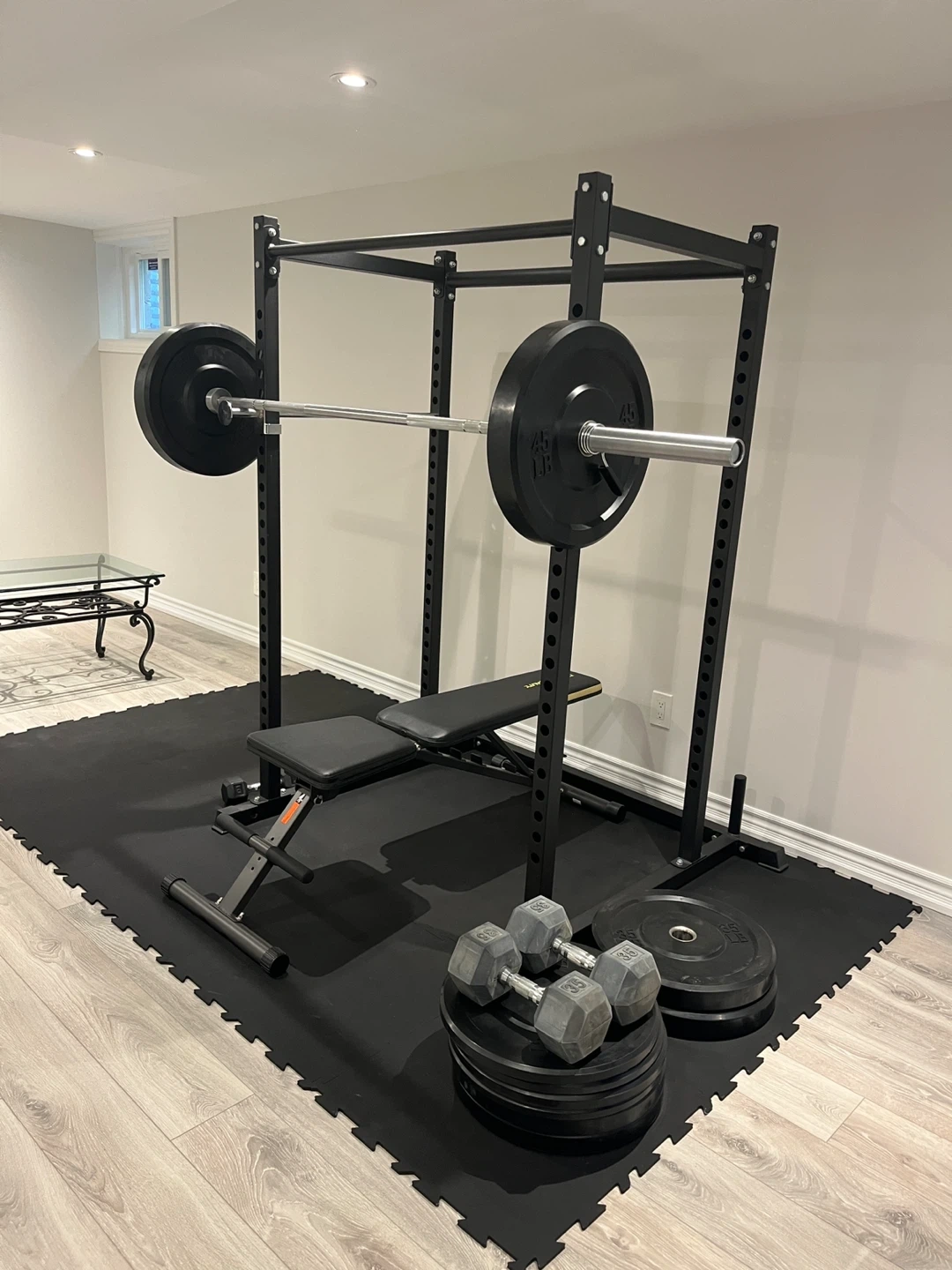 Selling a complete home gym setup! Includes a weight rack, bench, various weights. Perfect for setting up your own workout space at home. Ready for pickup! I paid $1600 Never used Brand new I am offering it for $1000 Squat rack Bar/weight plates (35s, 25s, 15s, 10s) Bench Mats