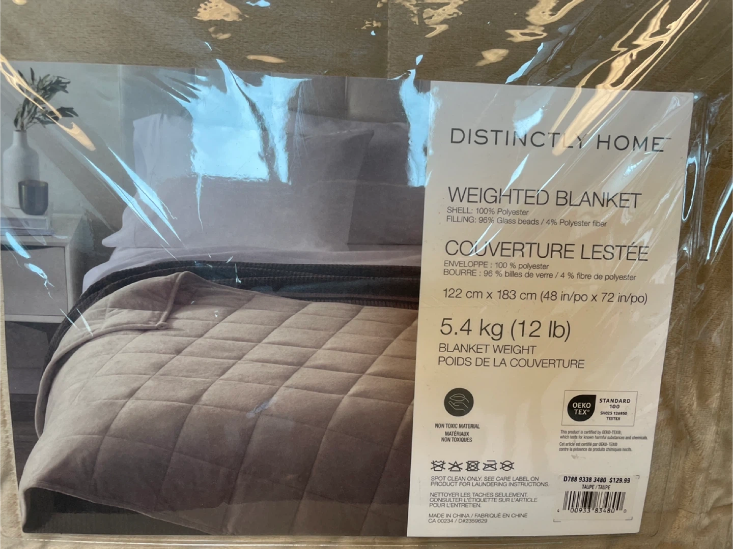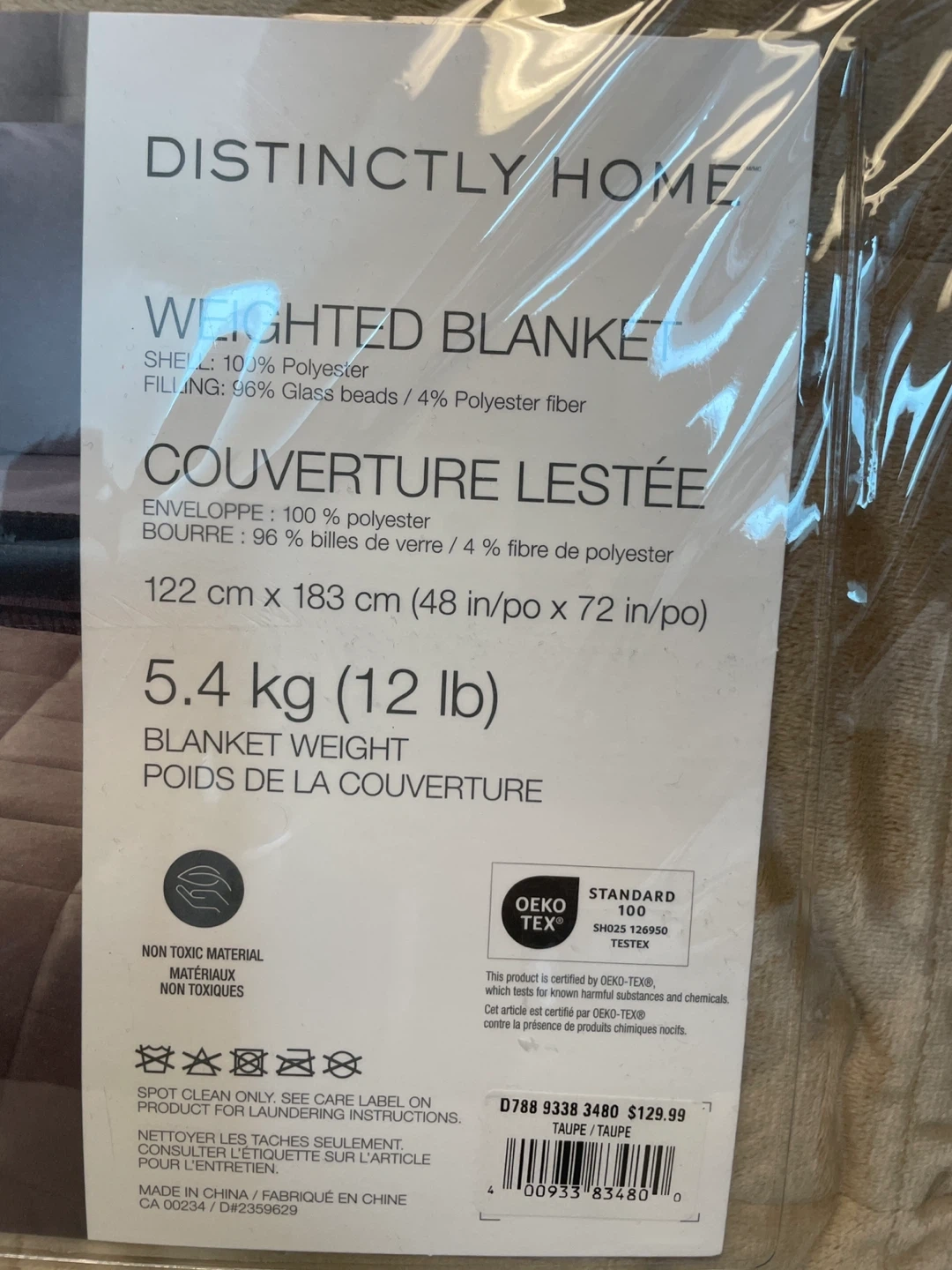 10Cozy up with this Distinctly Home weighted blanket! It measures 122 cm x 183 cm (48 in x 72 in) and weighs 5.4 kg (12 lb). The shell is 100% polyester, and the filling is 96% glass beads and 4% polyester fibre. It's a lovely taupe colour and is brand new.