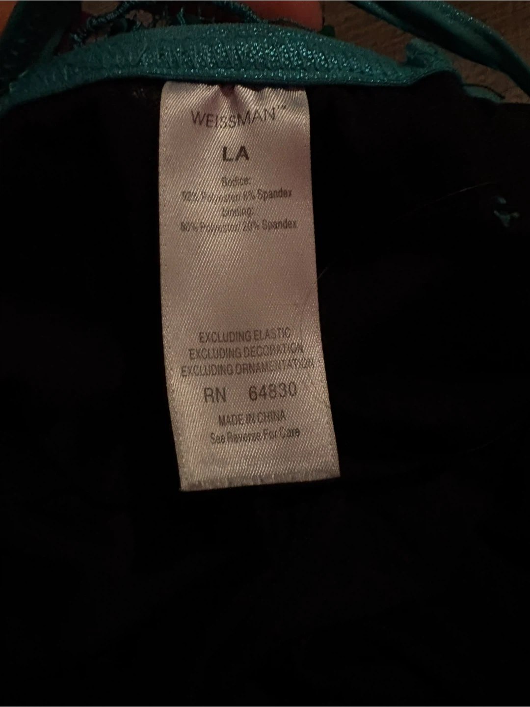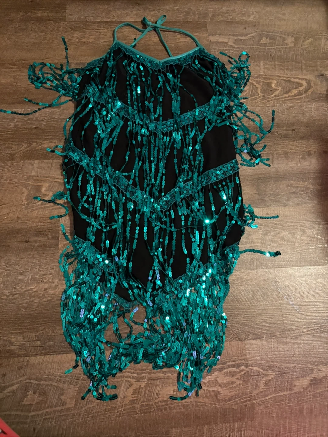 10Selling a Weissman dance costume in size Large Adult. It's black with turquoise sequins and fringe. The bodice is made of 92% polyester and 8% spandex, and the lining is 80% polyester and 20% spandex ( great for a Taylor swift costume)