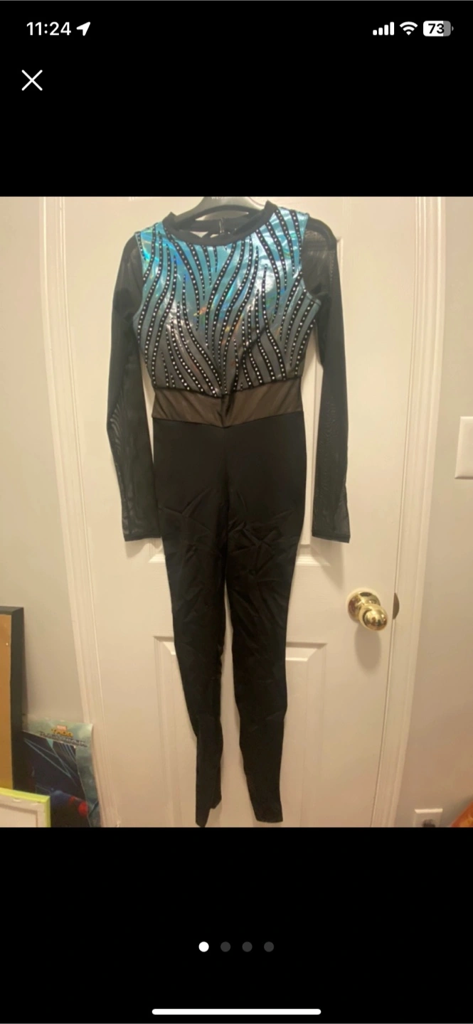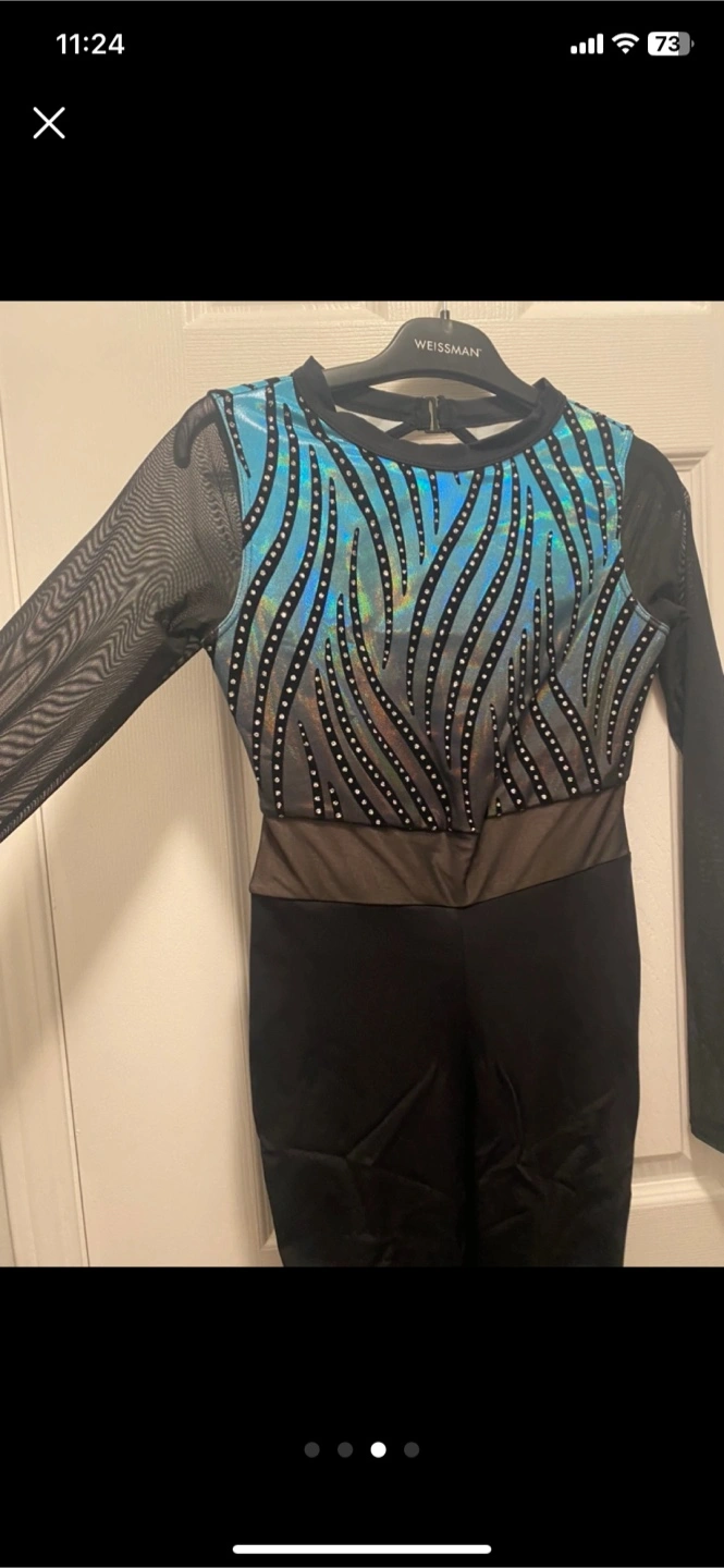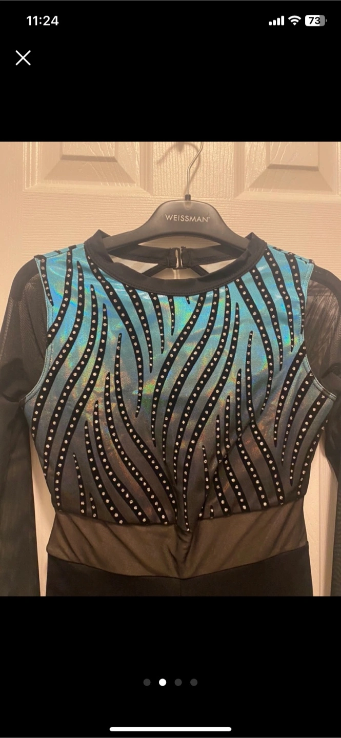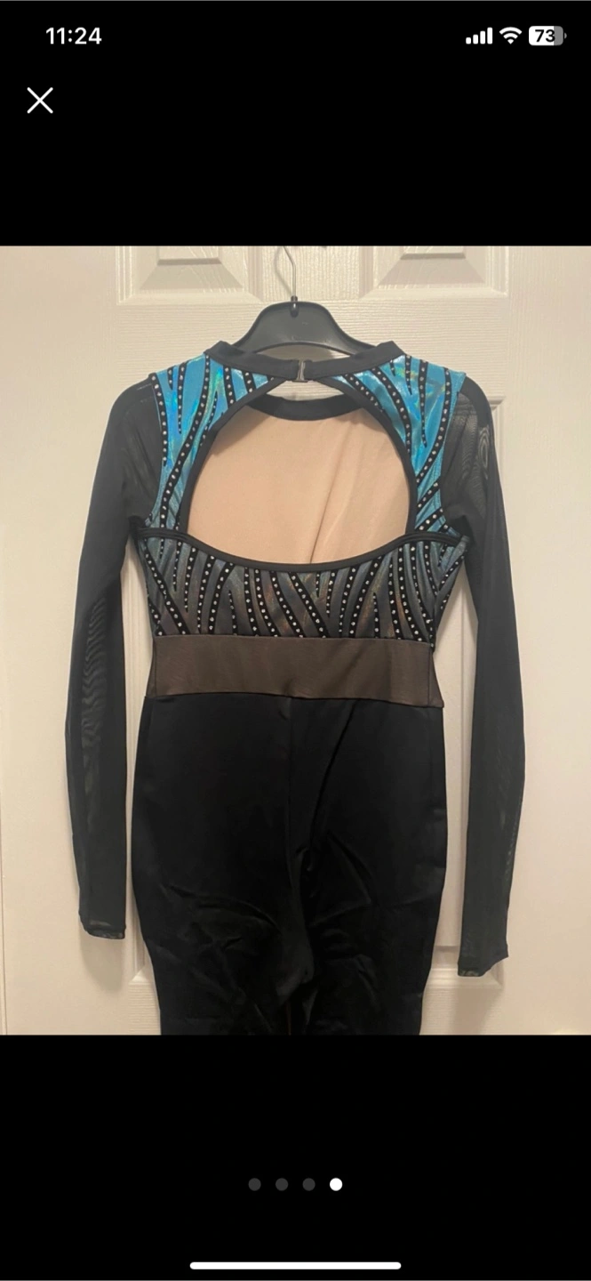 15Stunning dance leotard. Features long sleeves, a keyhole back, and a beautiful teal and black design with rhinestones. Perfect for performances or competition Approx ages 10-12 $30 firm