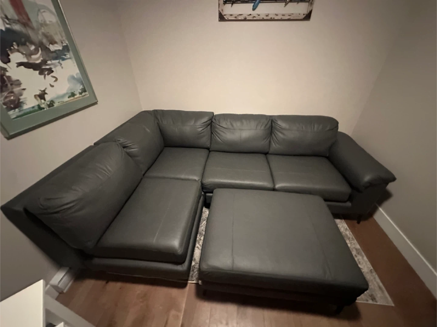 Lazy Boy Gray Leather 4-piece sectional with ottoman. Dimensions are 106" long base, 68" long wing, 33" high, and ottoman is 40"x30". It's made of leather and has some light wear and tear.