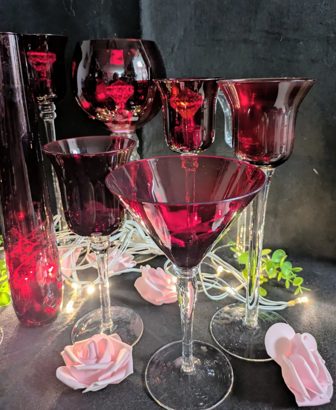 This collection includes a variety of red glassware pieces, such as martini glasses, stemmed goblets, and a tall vase. The glass has a deep ruby red hue, with some items featuring clear glass stems. They're perfect for adding a pop of colour to your table settings or for decorative use. Use these to serve drinks or as unique candle holders!