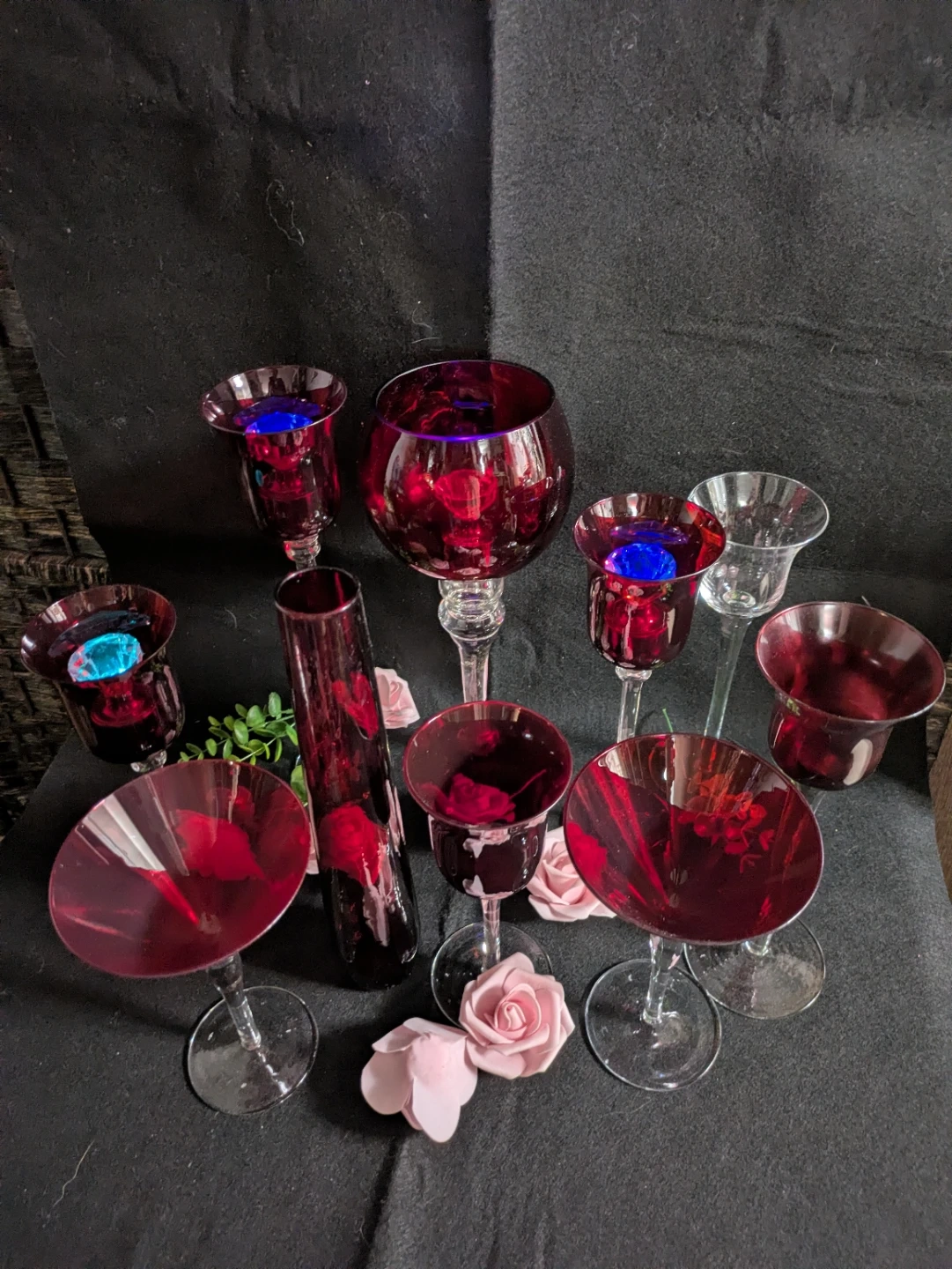 This collection includes a variety of red glassware pieces, such as martini glasses, stemmed goblets, and a tall vase. The glass has a deep ruby red hue, with some items featuring clear glass stems. They're perfect for adding a pop of colour to your table settings or for decorative use. Use these to serve drinks or as unique candle holders!