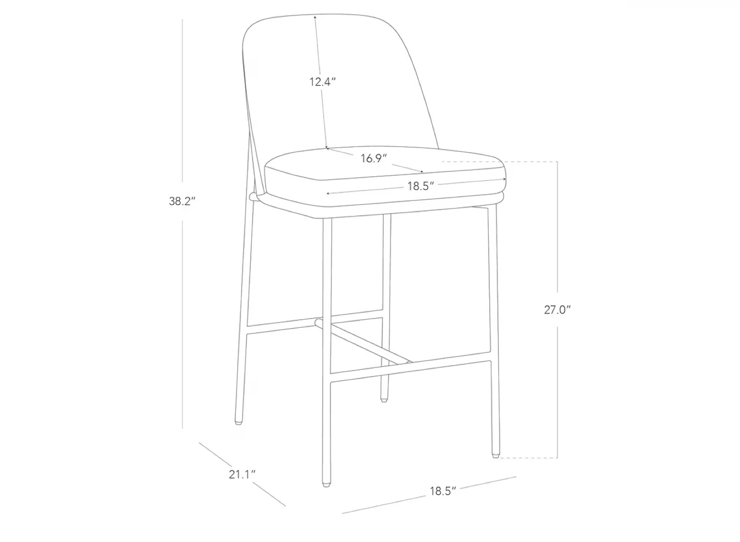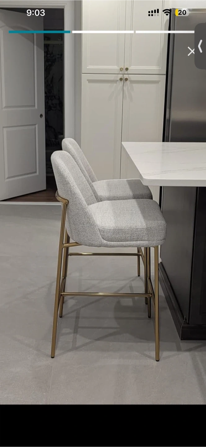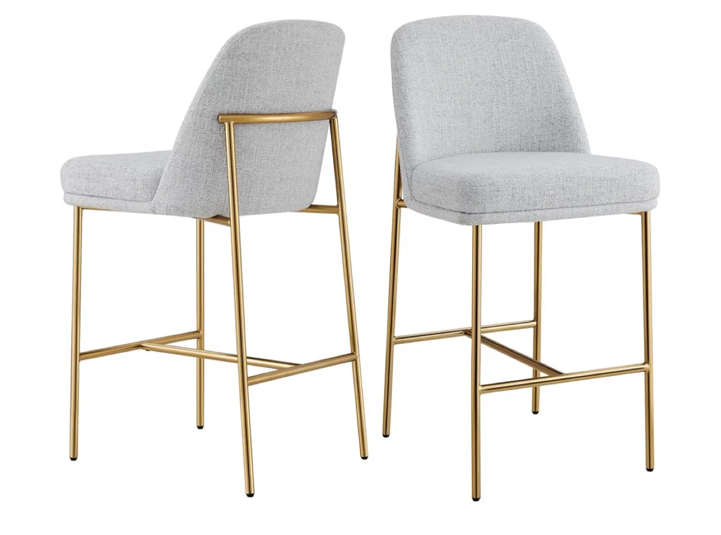 Selling a set of two bar stools with a light grey fabric upholstery and a modern gold metal frame. Seat dimensions are 18.5" wide by 16.9" deep. Total height is 38.2". These stools would be great for a kitchen island or home bar.