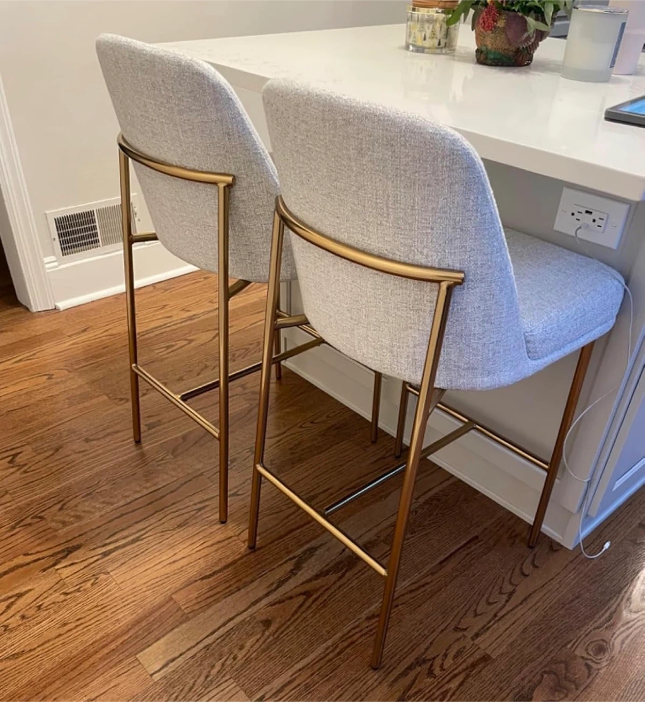 Selling a set of two bar stools with a light grey fabric upholstery and a modern gold metal frame. Seat dimensions are 18.5" wide by 16.9" deep. Total height is 38.2". These stools would be great for a kitchen island or home bar.