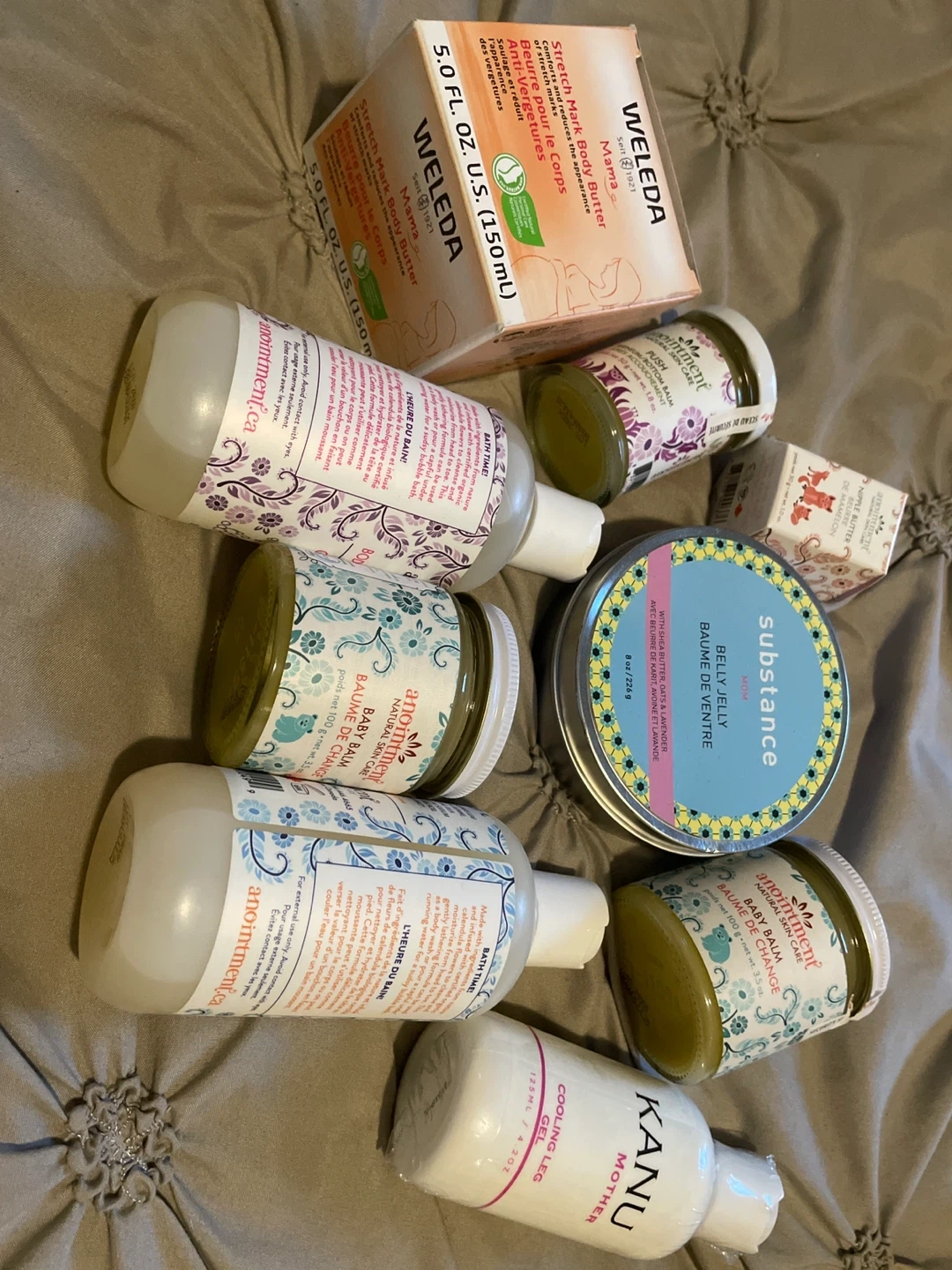 388Selling a bundle of skin care products including Weleda Stretch Mark Body Butter (5.0 FL. OZ./150mL), Kanu Mother Cooling Leg Gel (125mL/4.2OZ), Substance Mom Belly Jelly (8 oz/226 g), and Anointment Baby Balm. Perfect for moms and babies!