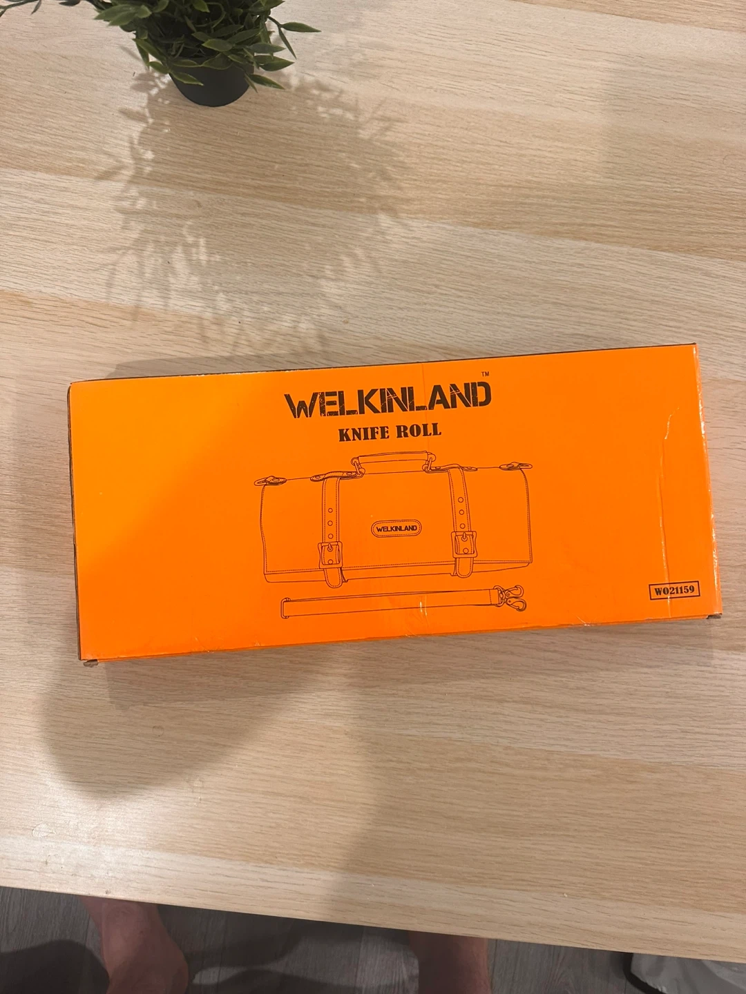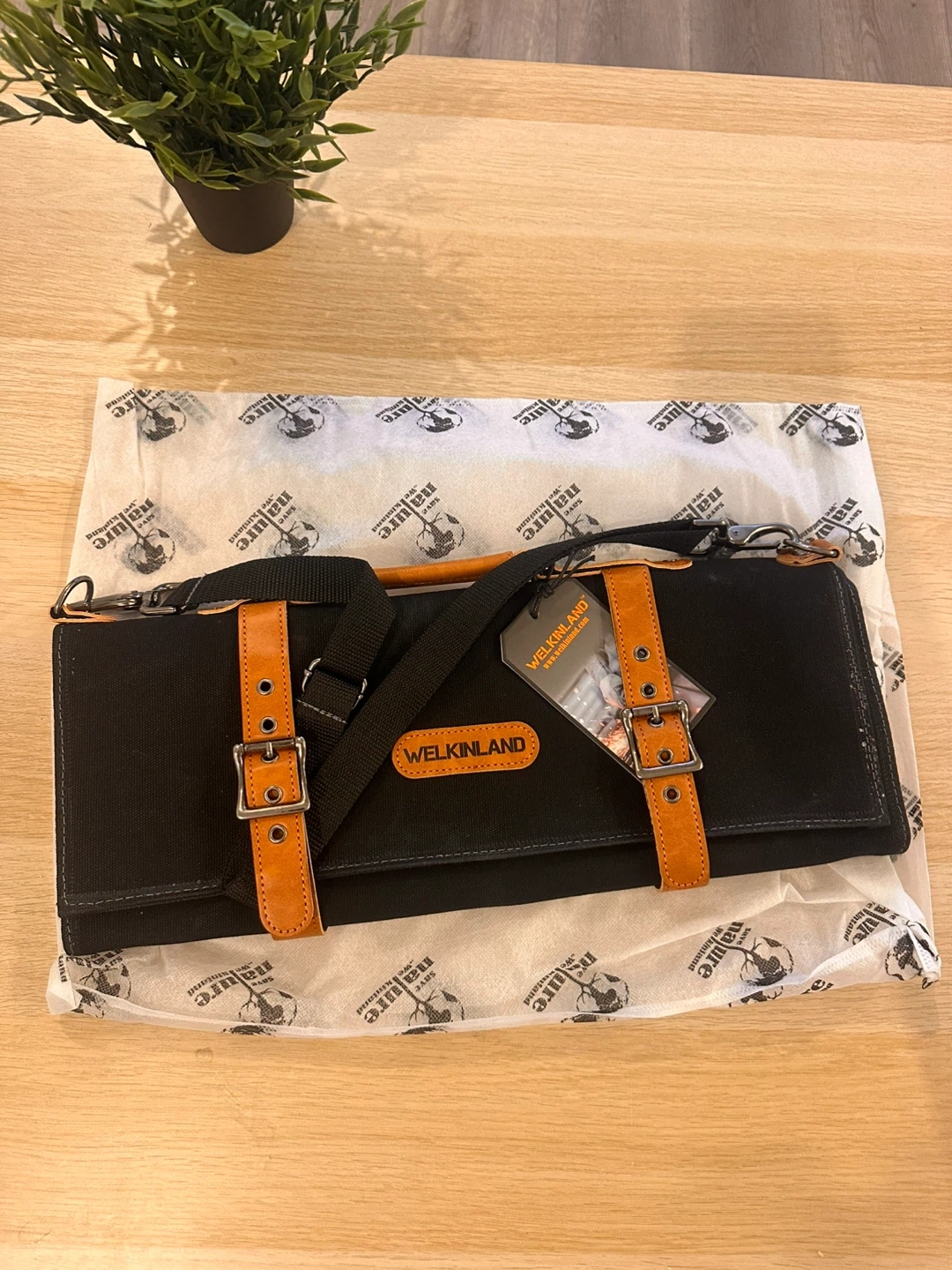 Selling a brand new WELKINLAND knife roll bag, still in its original box! This is perfect for chefs or culinary students looking for a stylish and practical way to carry their knives. It features a durable black canvas exterior with tan leather accents and secure buckle closures. Keep your knives safe and organized with this high-quality knife roll