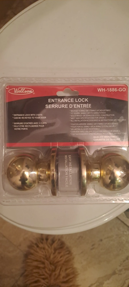 Selling a brand new Wellson entrance lock, model WH-1886-GO. It comes with 3 keys and can be re-keyed to your door. Features: - Adjustable backset: 60mm(2-3/8") / 70mm(2-3/4") - Fits doors 35mm(1-3/8") to 50mm(2") thick - Solid brass or stainless steel construction - Meets ANSI specifications for Grade 3 - All installation accessories and instructions are included Easy installation!