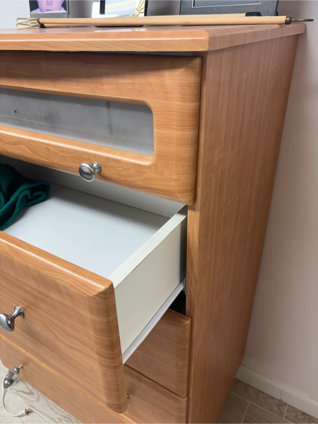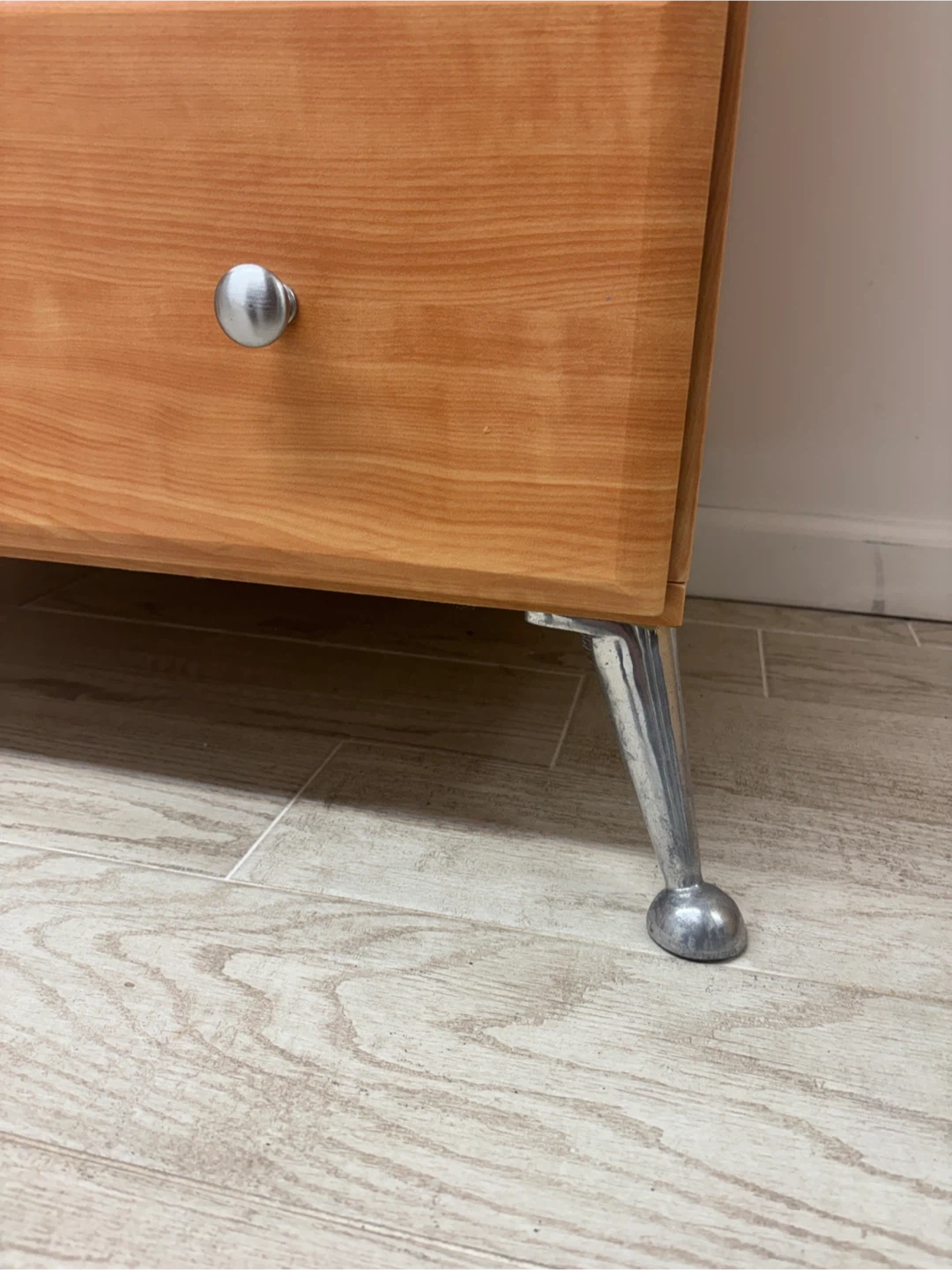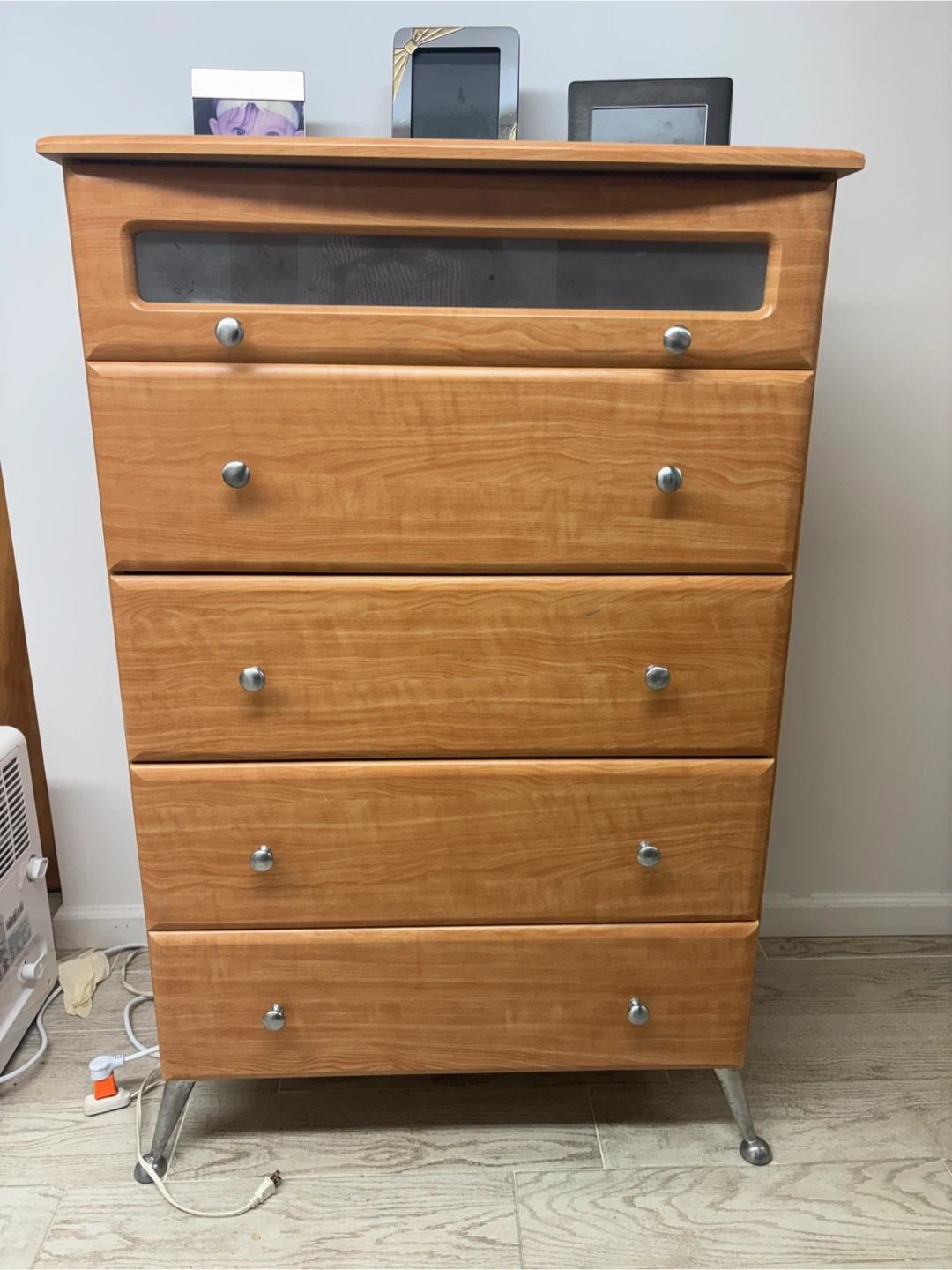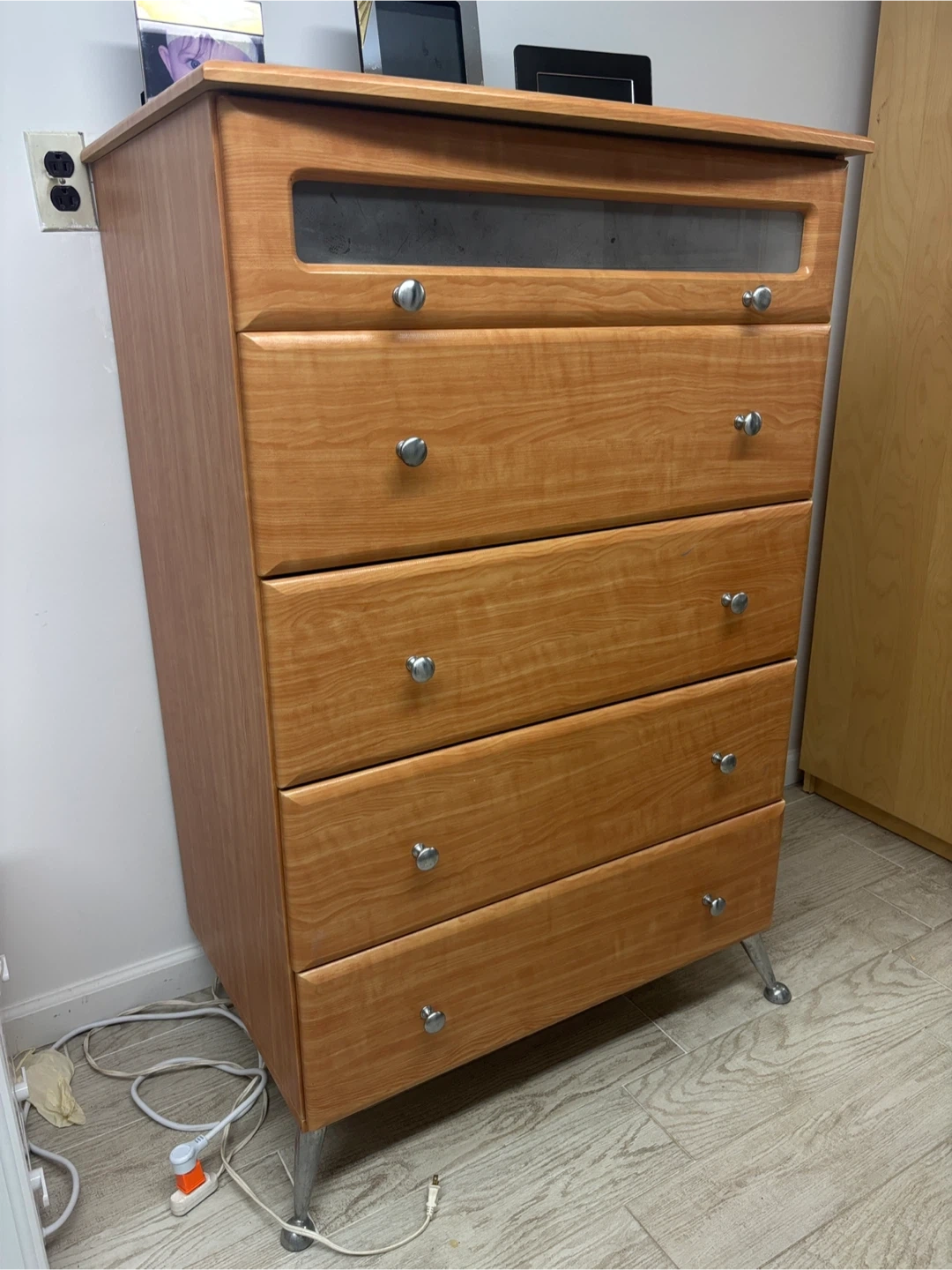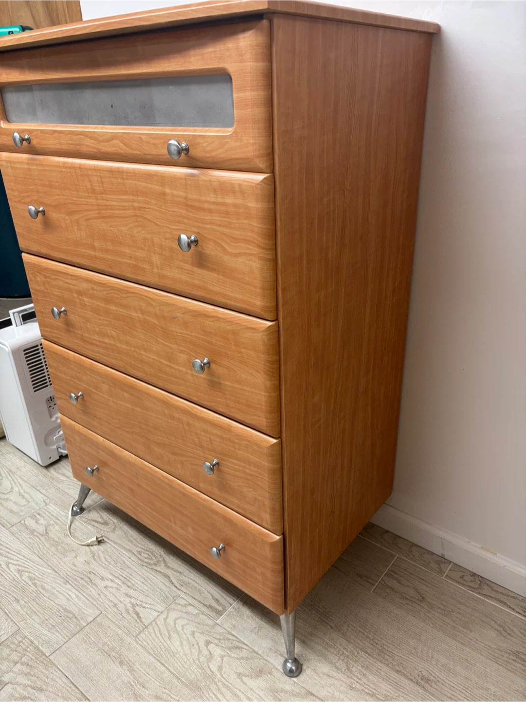 Functional 5-drawer dresser with a light wood finish and modern metal legs.