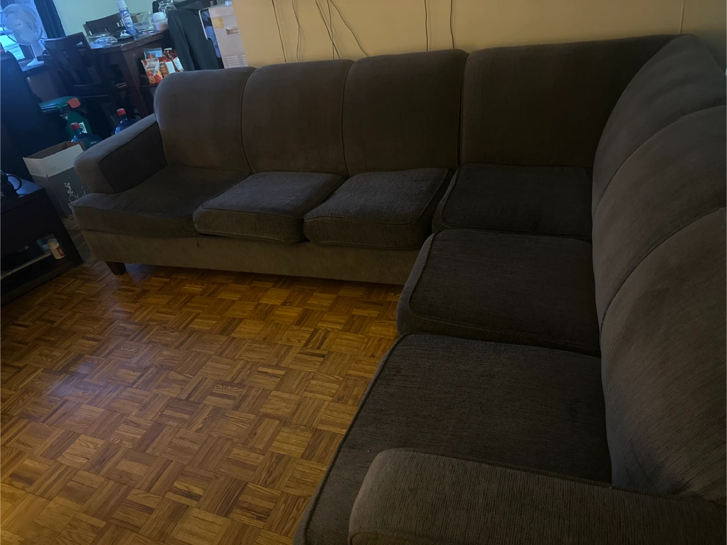 This is a grey sectional couch with a pull-out bed. The fabric appears to be a soft microfiber. It's a spacious couch that can seat multiple people. The pull-out bed makes it a great option for hosting guests!