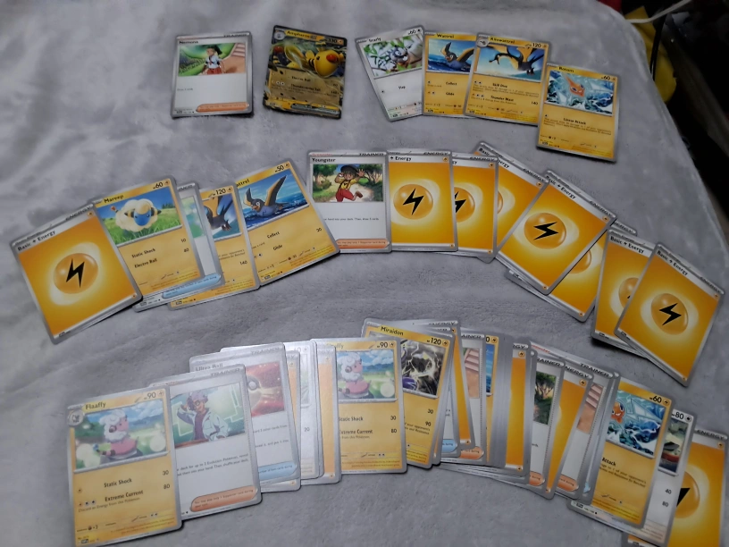 Selling a collection of Pokémon trading cards! Includes various Pokémon such as Mareep, Flaaffy, and Miraidon, as well as trainer cards and energy cards