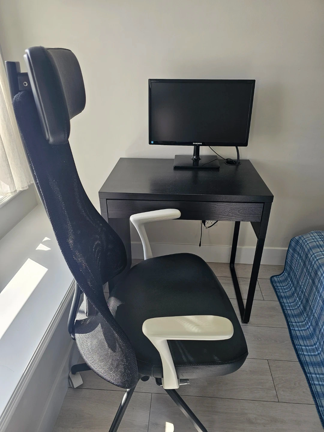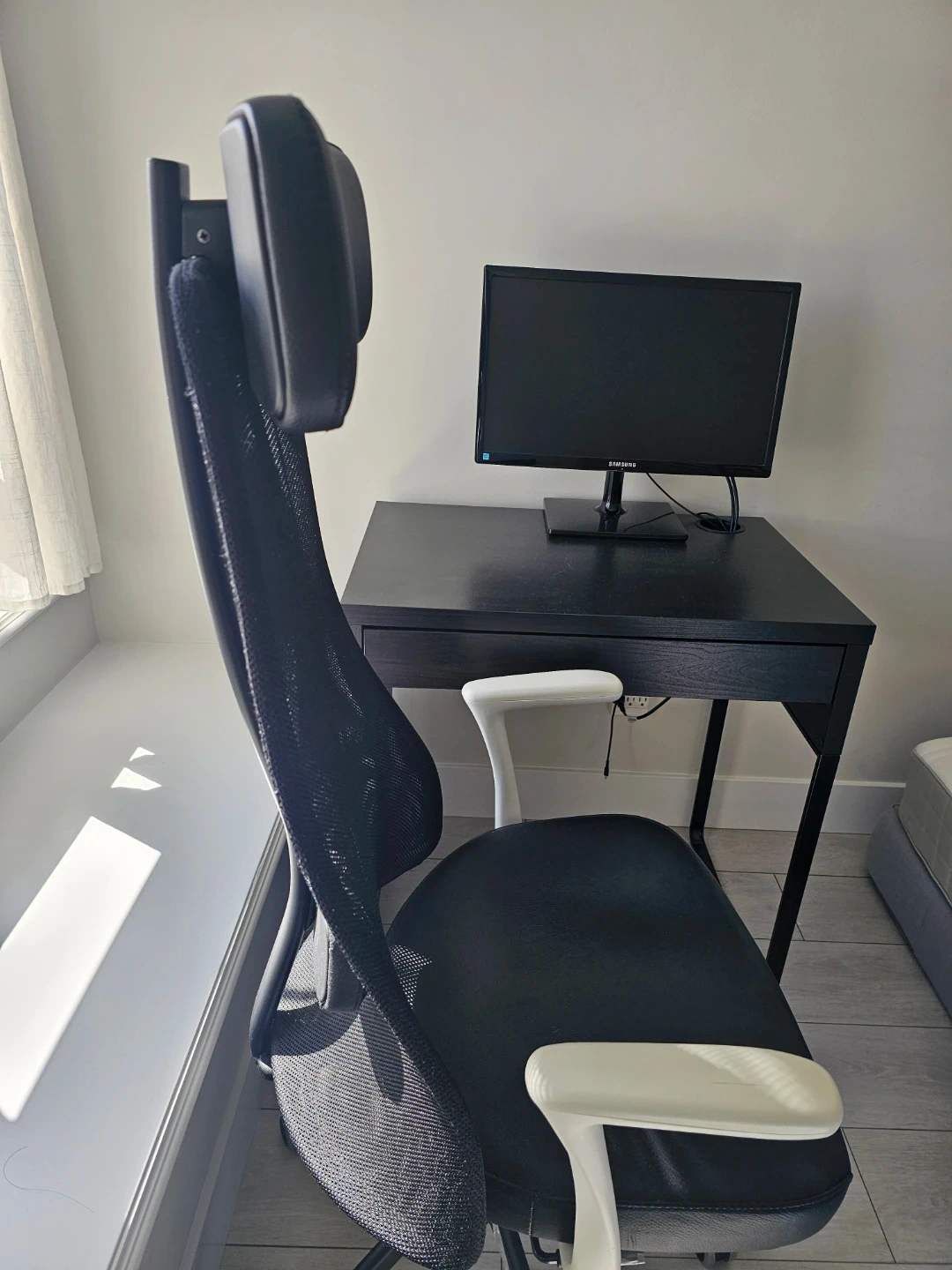 Mesh office chair in black with FREE Ikea Micke desk. It's got adjustable armrests and headrest for comfort. Ideal for long work sessions at your desk.