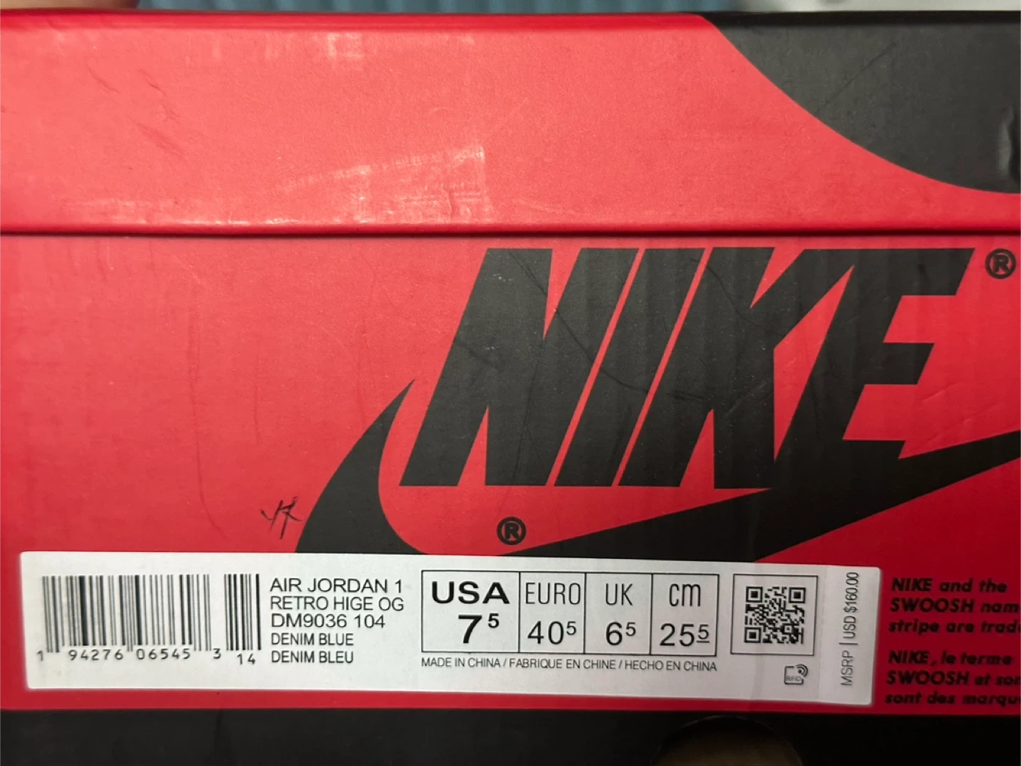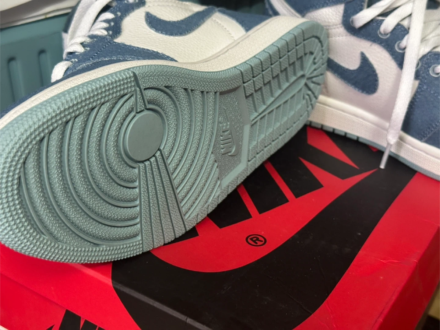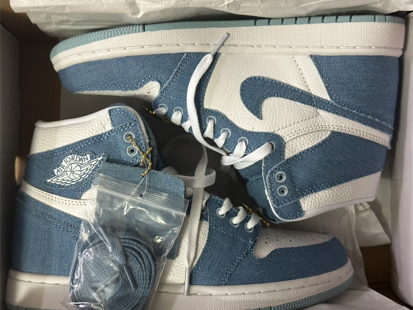 These Air Jordan 1 High OG sneakers feature a denim and white colorway. They include original laces and Jordan-themed lace locks. Comes in its original box.