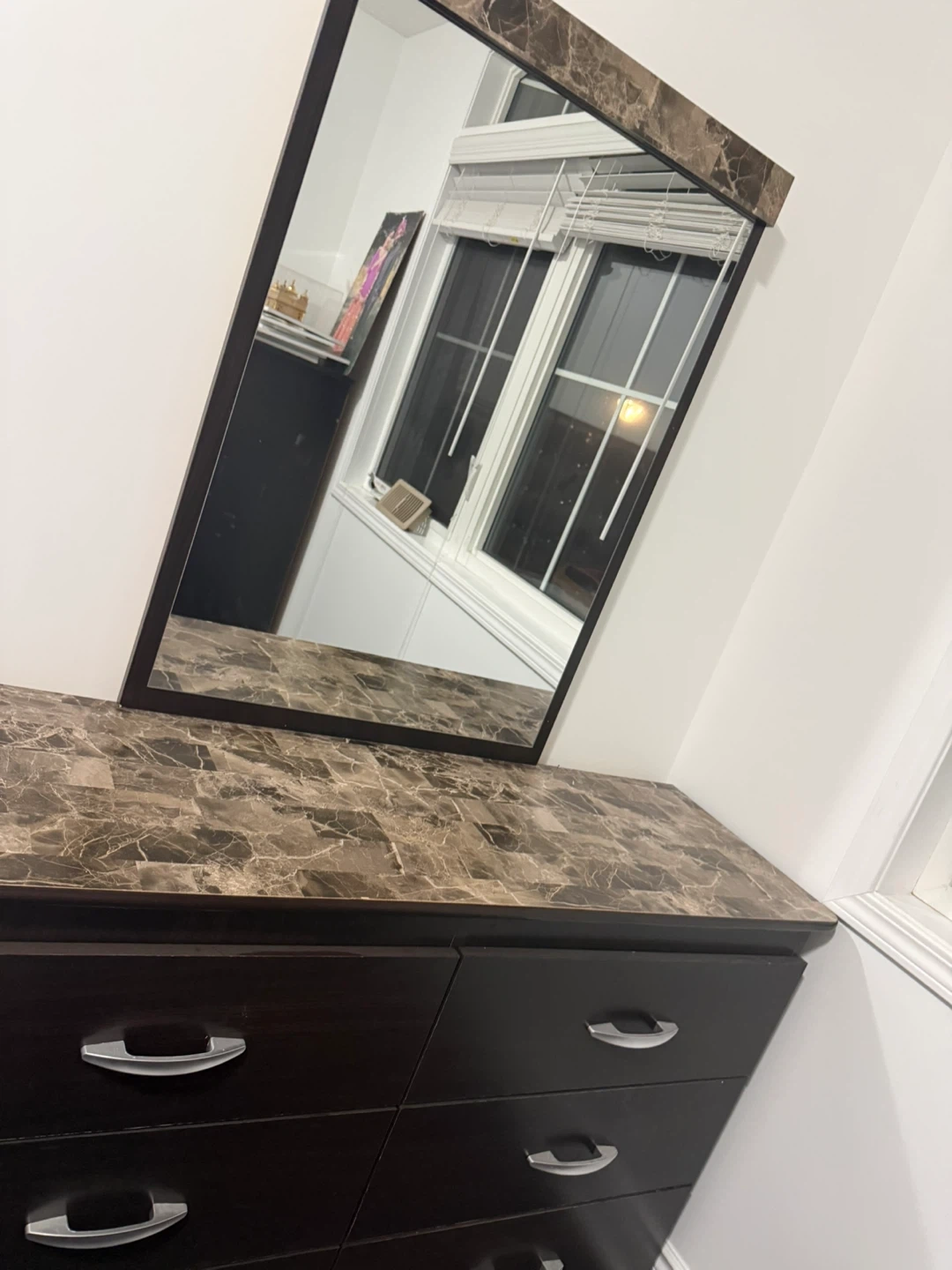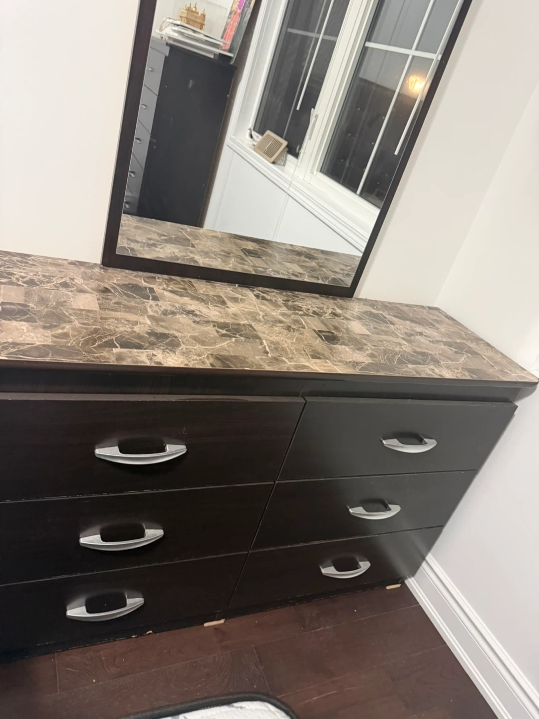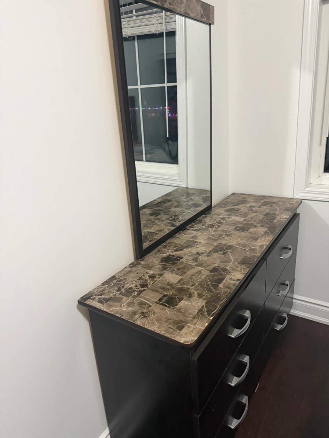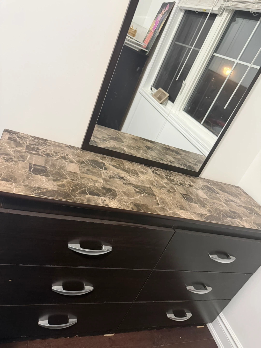 Dark brown dresser with a marble-look top. It has six drawers for storage. Includes a matching mirror. Great for organizing clothes and accessories!
