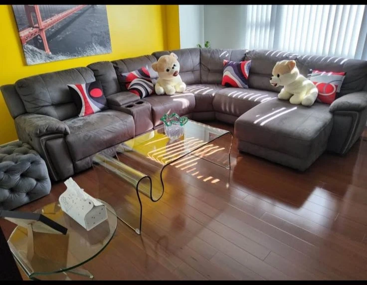 A spacious grey sectional sofa. It features multiple reclining seats for ultimate comfort and has built-in cup holders. This sofa's neutral colour makes it a versatile addition to any living room.