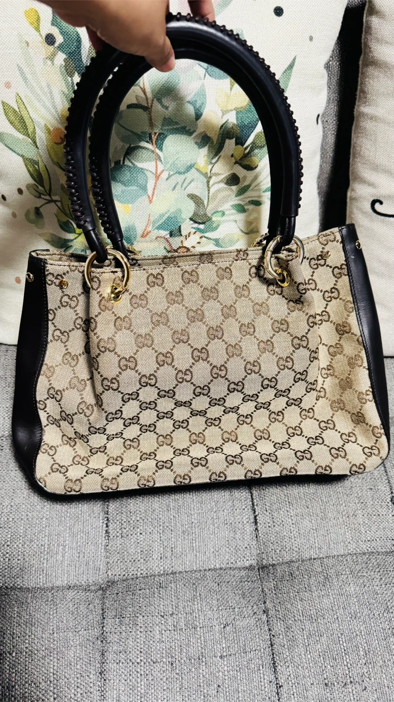 This Gucci tote bag features the iconic GG monogram canvas with black leather trim and handles. It has a spacious interior lined with black fabric. Gold-tone hardware is present throughout. This bag is great for everyday use, carrying your essentials in style.