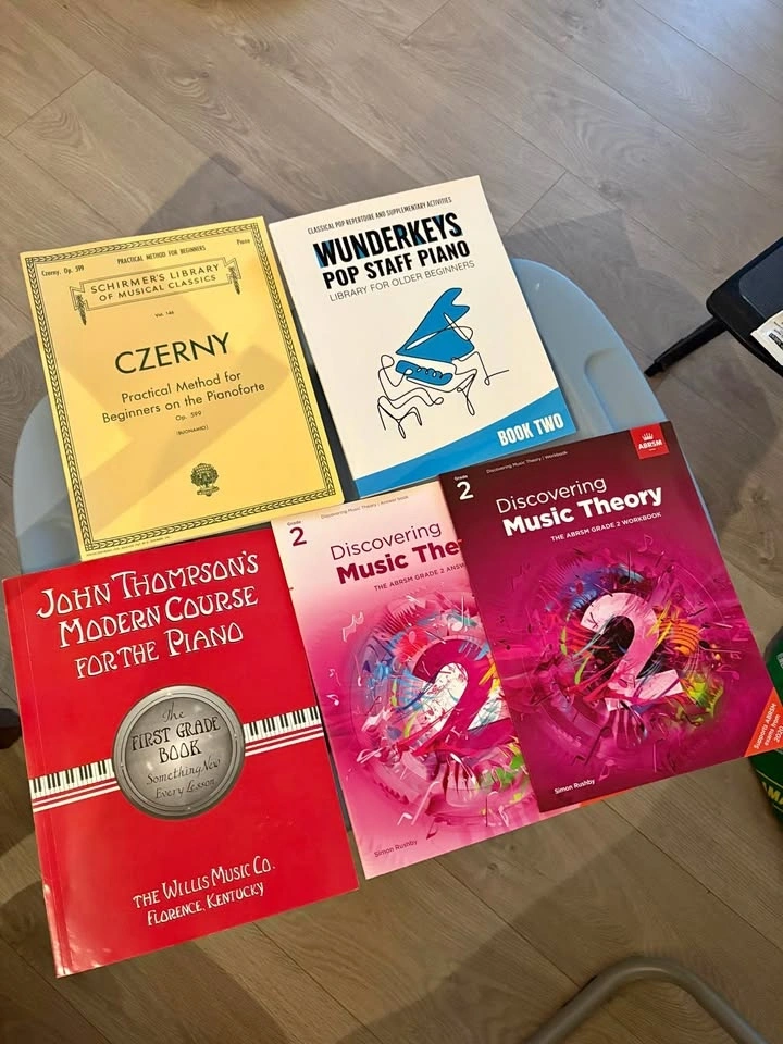Great collection of adult piano and music theory books. Got Czerny Practical Method for beginners, Wunderkeys Pop Staff Piano Book Two for older beginners, John Thompson's Modern Course The First Grade Book, and ABRSM Discovering Music Theory Grade 2 Workbook & Answer book. Good for anyone learning piano or music theory. Each $5, $20 if you take all.