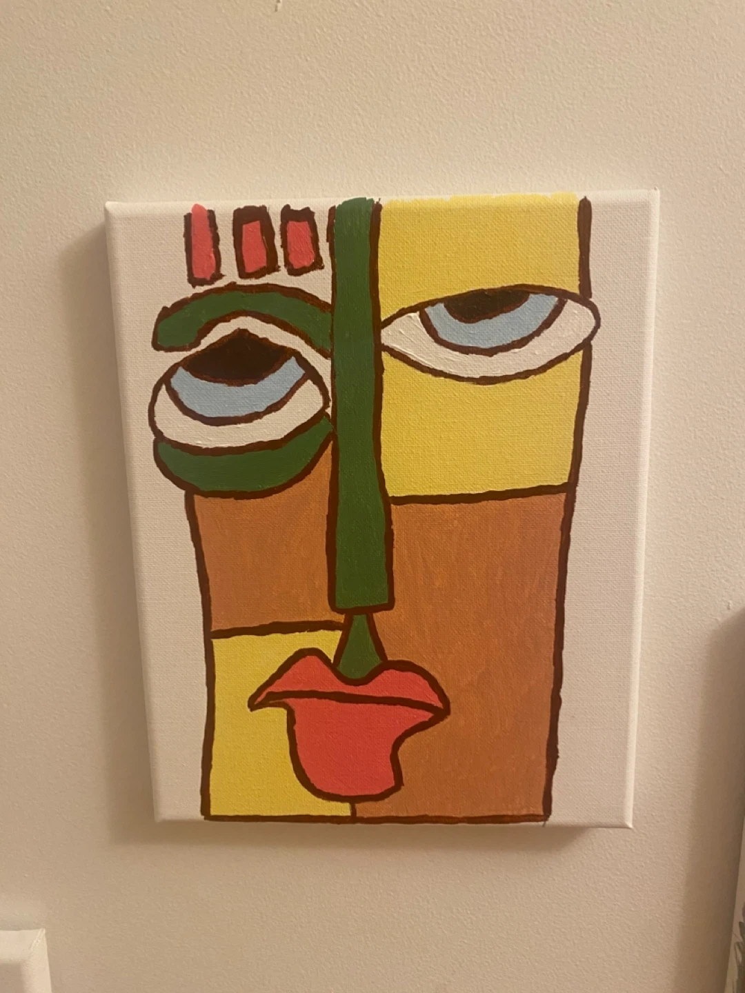 A modern abstract painting featuring a stylized face. The canvas art uses bold blocks of colour, including yellow, orange, brown, and red. It's a unique piece for home decor.