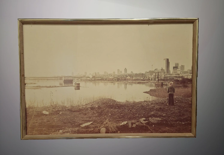 This is a framed photograph of the Vancouver skyline in the late 70s. Photograph is taken from False Creek (Expo 86). The photograph is in sepia tone. The photograph is framed in a gold coloured frame.