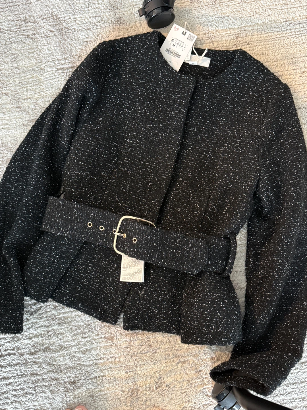 Zara black textured jacket with a removable belt. It features a cinched waist and a classic collarless design. This versatile jacket is perfect for adding a touch of sophistication to any outfit.